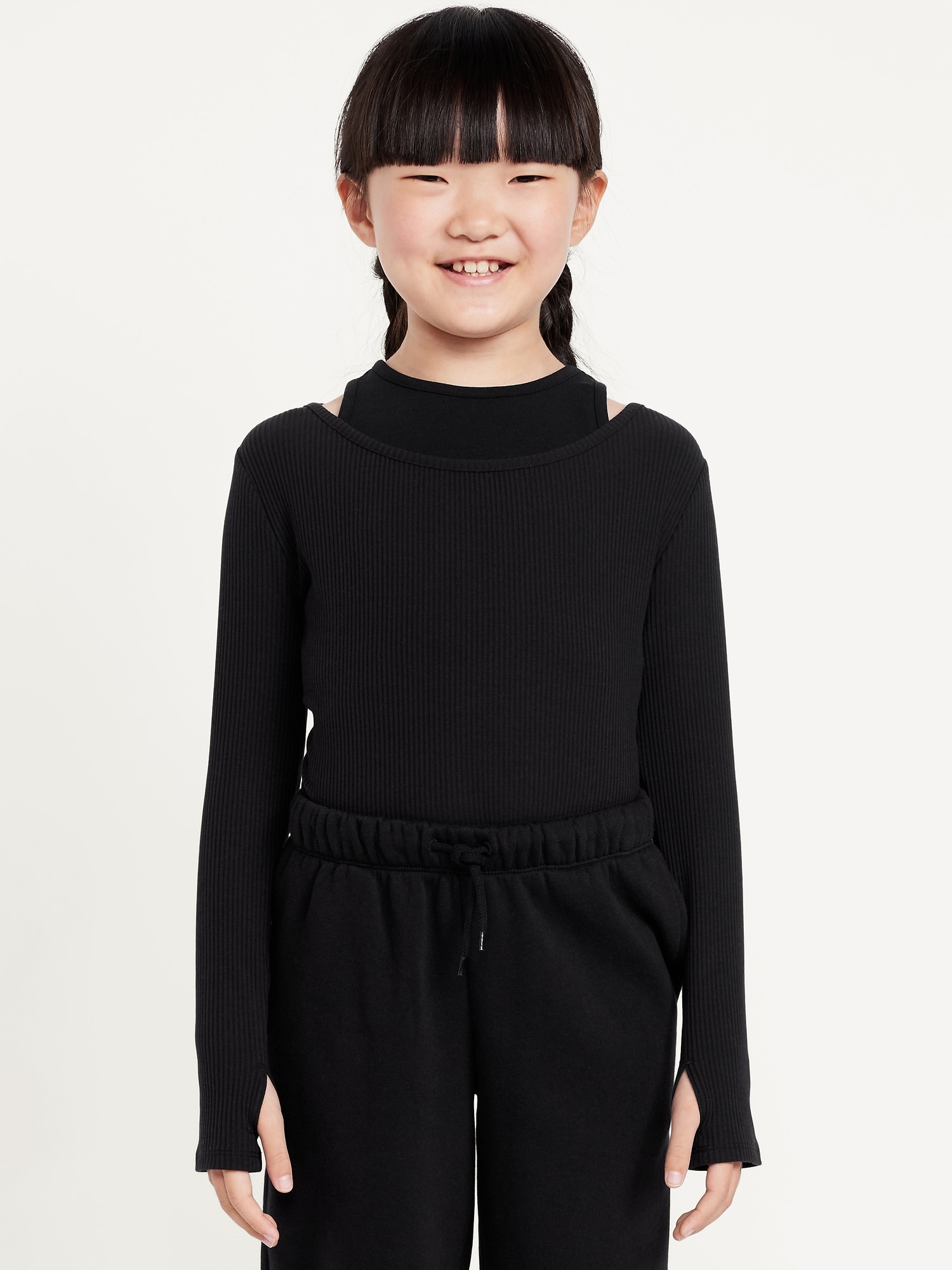 2-In-1 Ribbed Performance Top for Girls: boat neck, long sleeves, thumb-hole slits, tank top underneath, high neckline, sleeveless, #789715