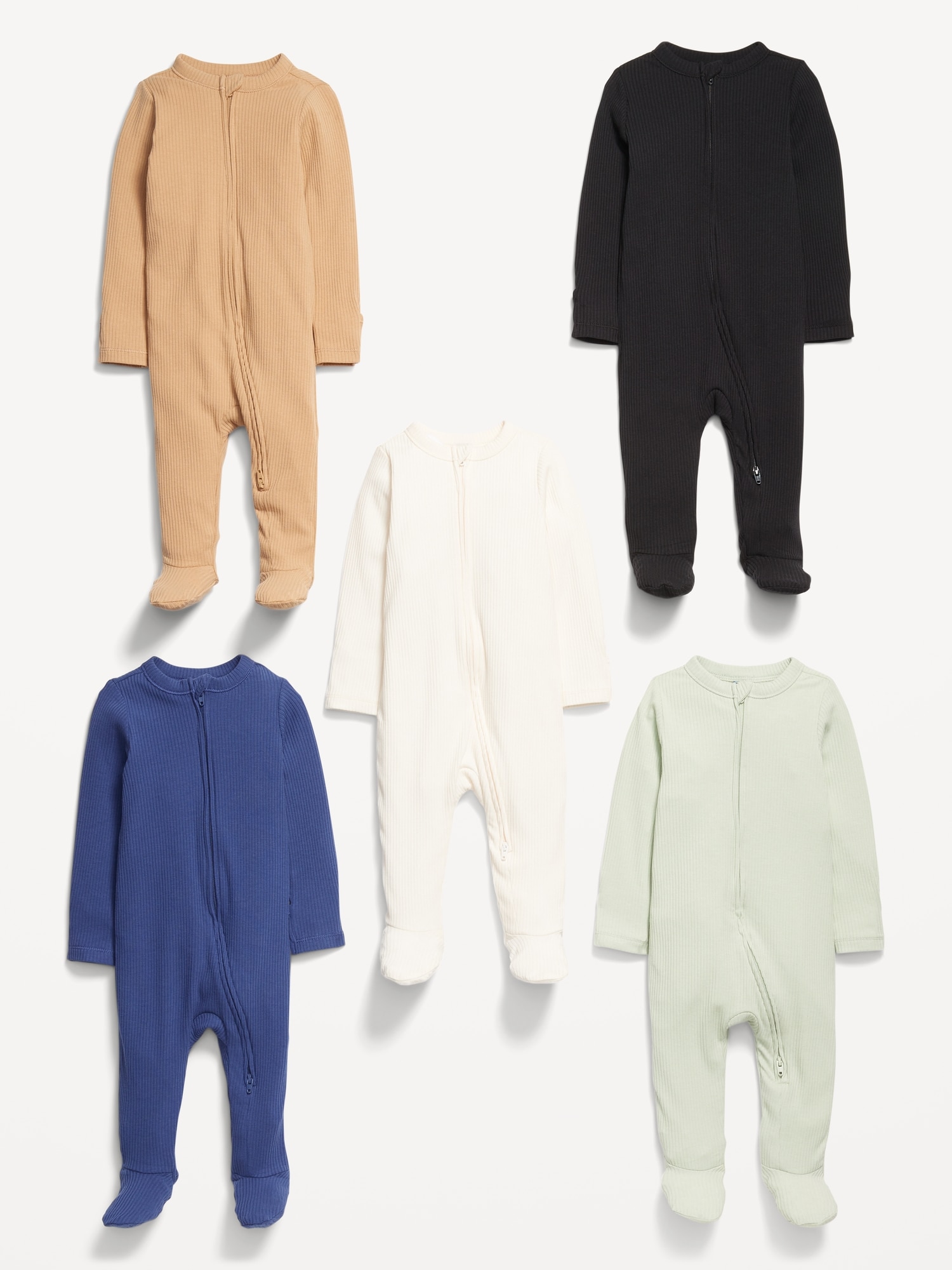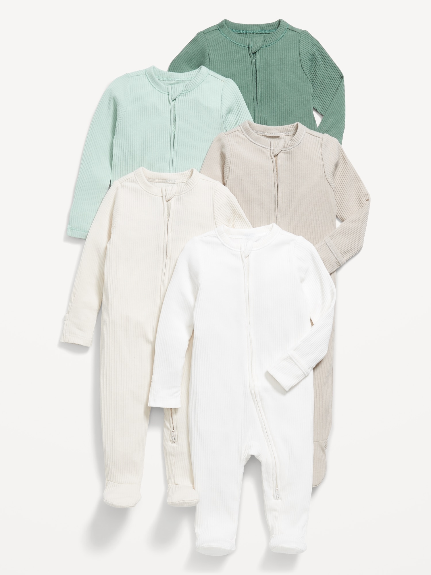 2-Way-Zip Sleep & Play Footed One-Piece 5-Pack for Baby: rib-knit crew neck, long sleeves, fold-over mittens at each sleeve, reversible two-way zipper, sewn-in feet, #694133