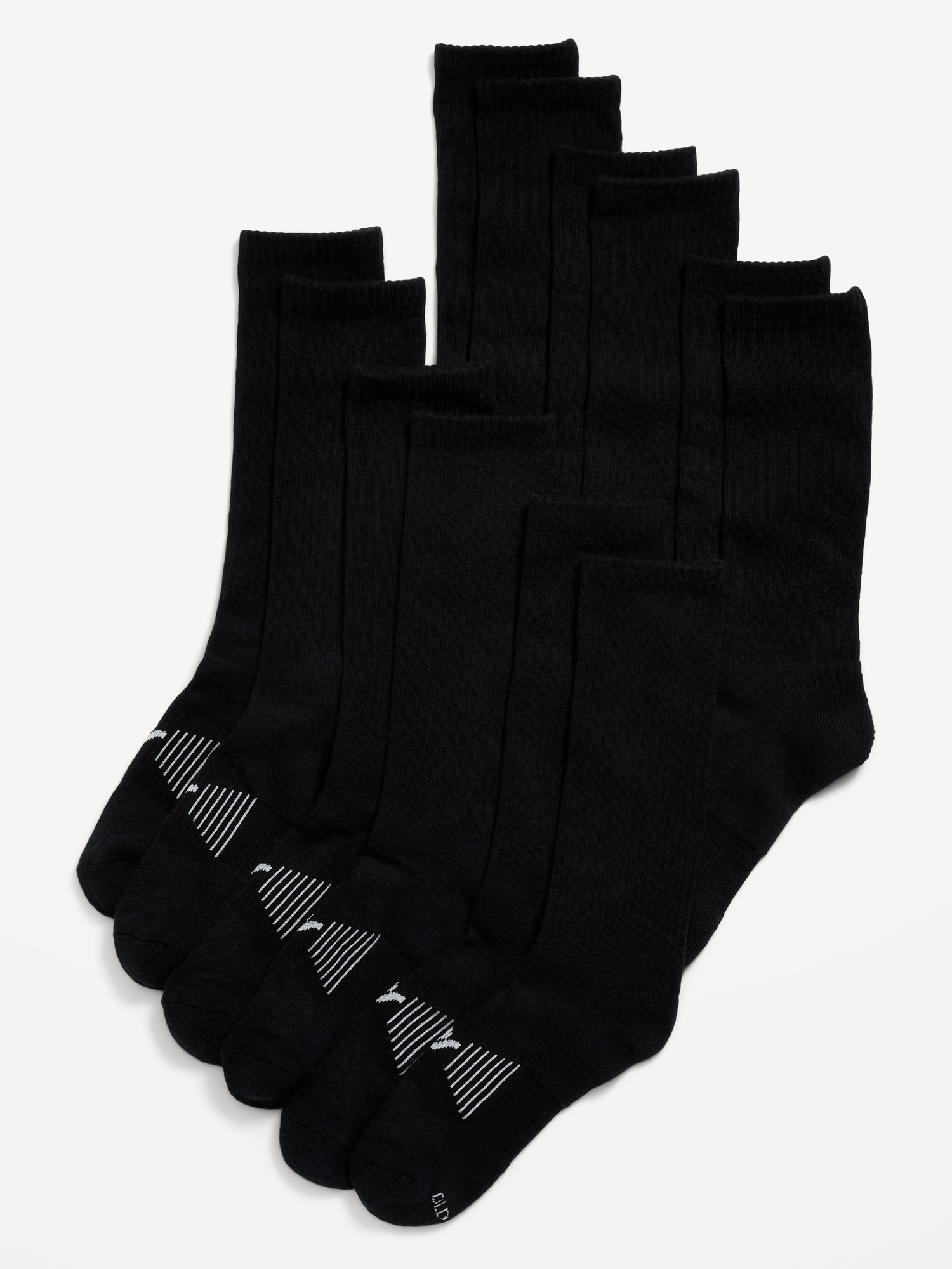 6-Pack Athletic Tube Socks for Men: pack includes 6 pairs of solid performance socks, notched toe seams for comfort, arch support, zoned cushioning, go-dry wicks moisture, #684851