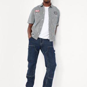 90's Straight Built-In Flex Carpenter Jeans: Relaxed through the hip and thigh, with a straight leg and vintage feel.button front, zip fly, hip pockets, back patch pockets, hammer loop, reinforced knees, #788044