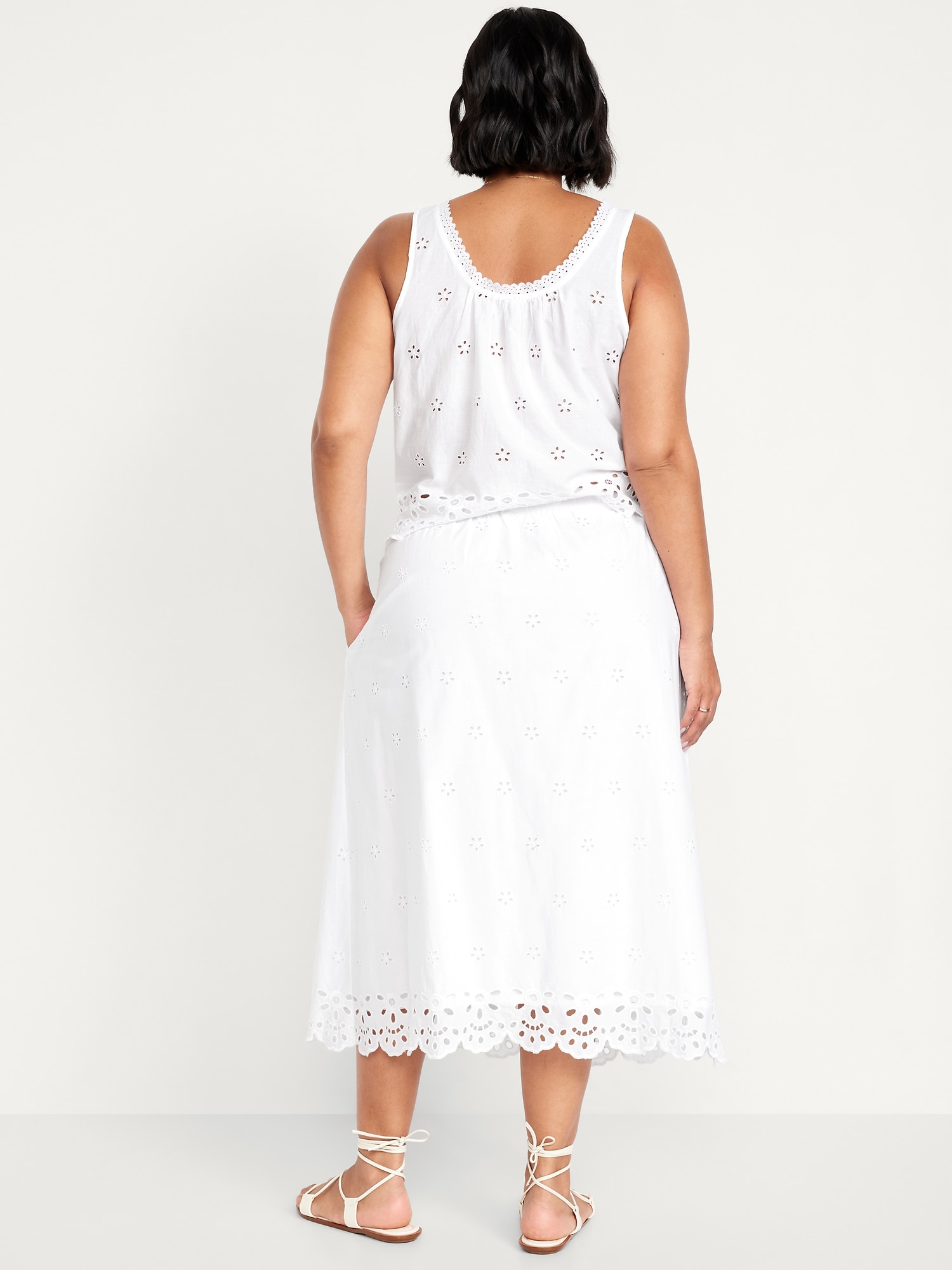 A-Line Eyelet Midi Skirt: elastic pull-on waistband, all-over embroidered detail, eyelet-scallop hem, #705284