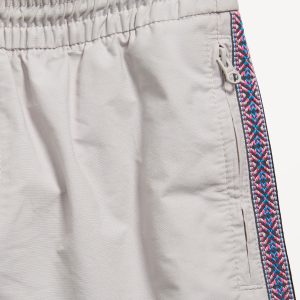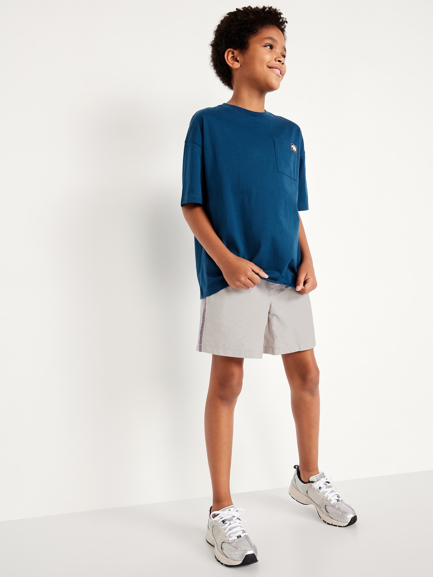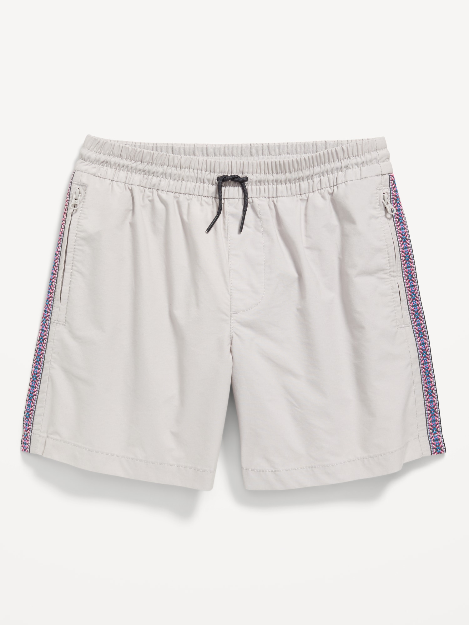 Above Knee Tech Zip-Pocket Shorts for Boys: elasticized waistband, functional drawstring, zippered pockets, contrasting patterned tape trim at sides, #686068