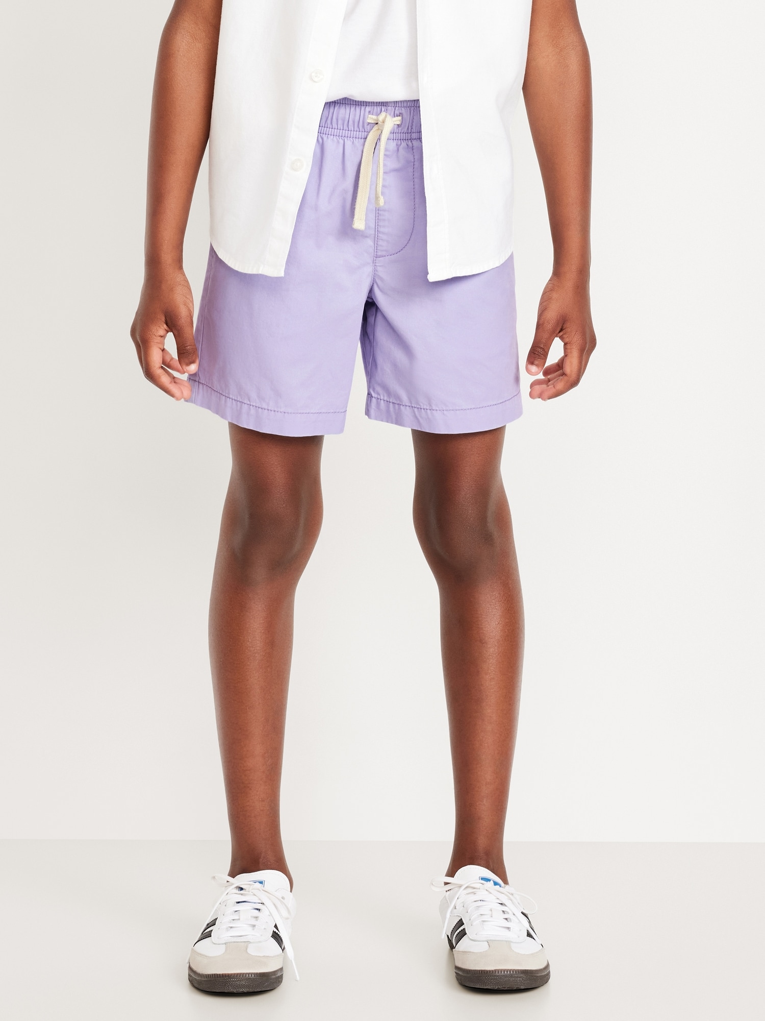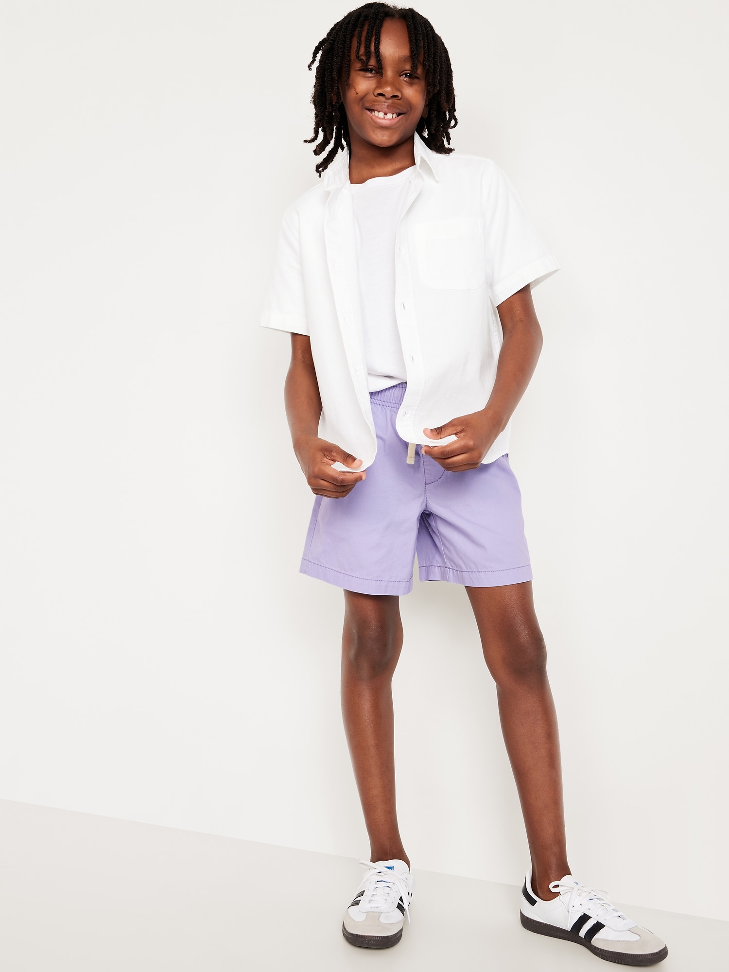 Above Knee Twill Pull-On Shorts for Boys: elasticized waistband, functional drawstring, faux fly, diagonal on-seam pockets, single welt pocket at back, easy pull-on style, #860738