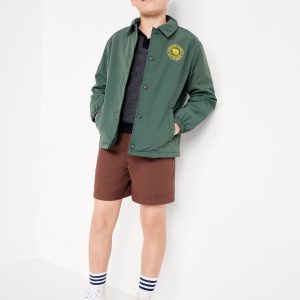 Above Knee Twill Pull-On Shorts for Boys: elasticized waistband, functional drawstring, faux fly, diagonal on-seam pockets, single welt pocket at back, easy pull-on style, #860738