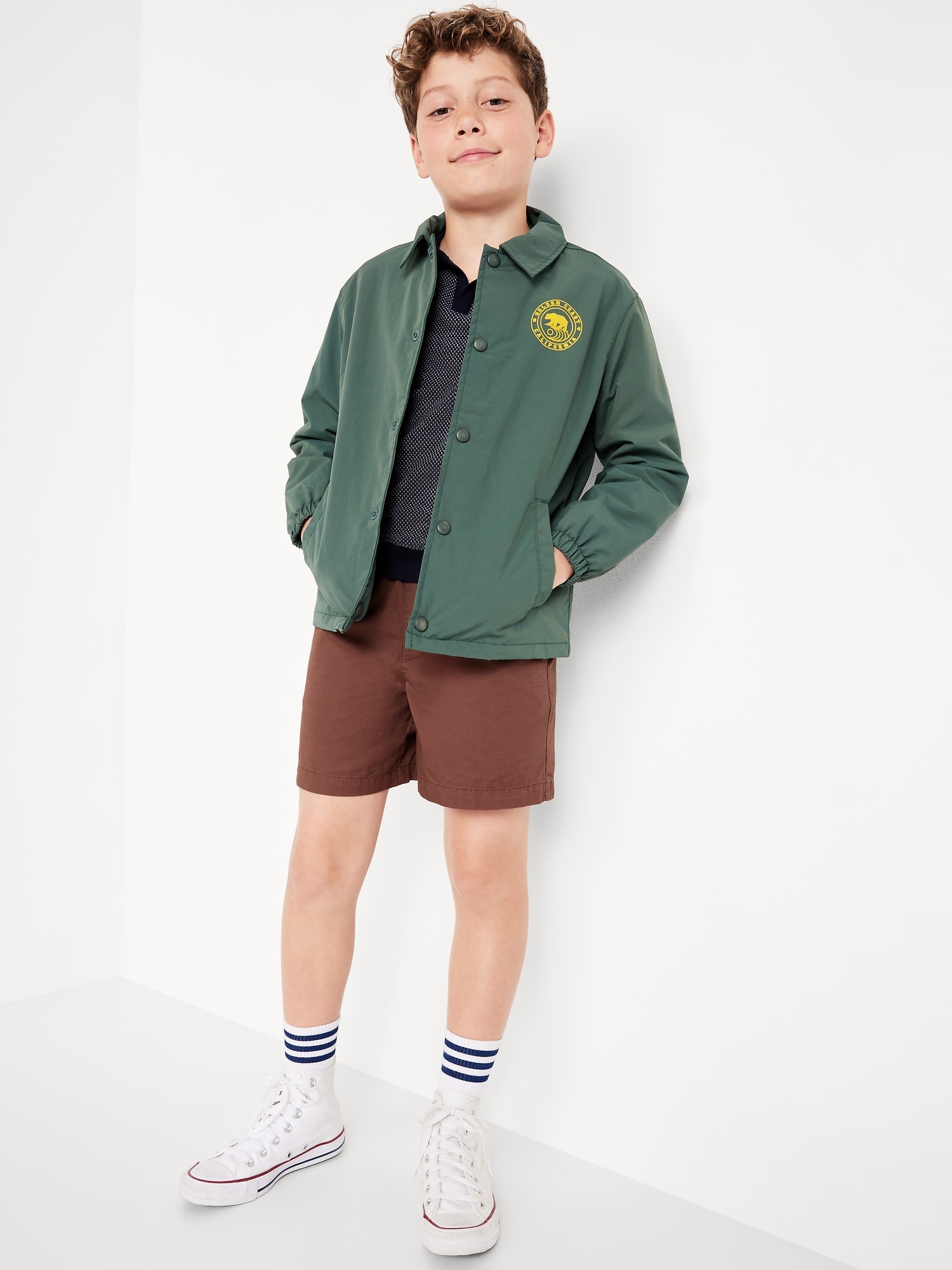 Above Knee Twill Pull-On Shorts for Boys: elasticized waistband, functional drawstring, faux fly, diagonal on-seam pockets, single welt pocket at back, easy pull-on style, #860738
