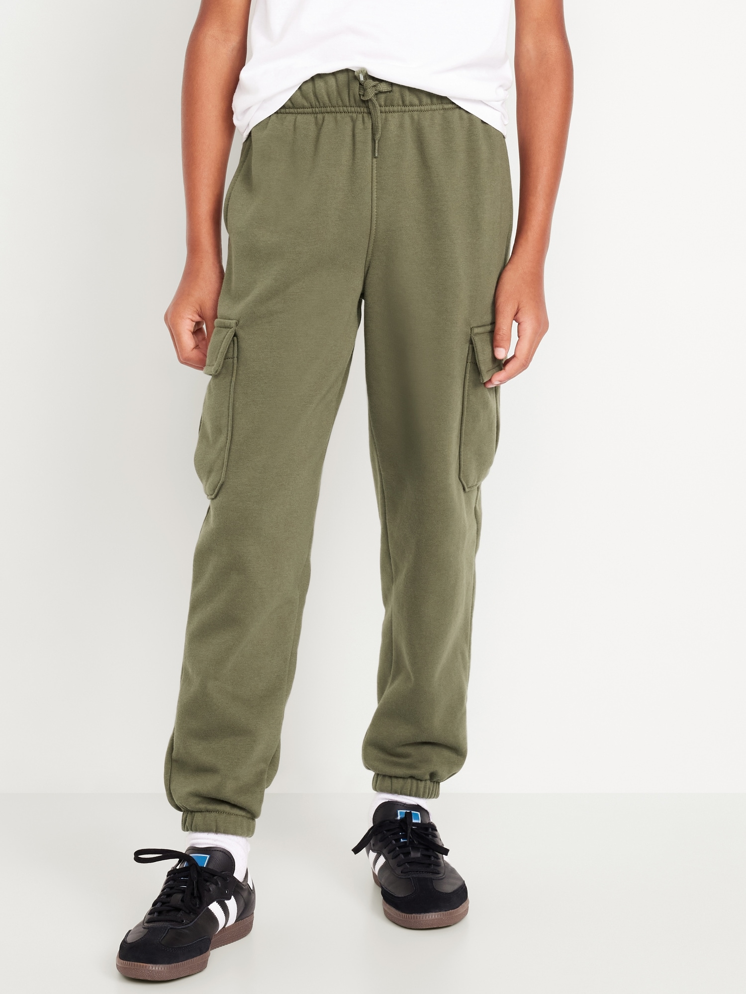 Baggy Cargo Jogger Sweatpants for Boys: elasticized waist, functional drawstring, on-seam welt pockets, snap-button cargo pockets, cinched leg cuffs, #564944