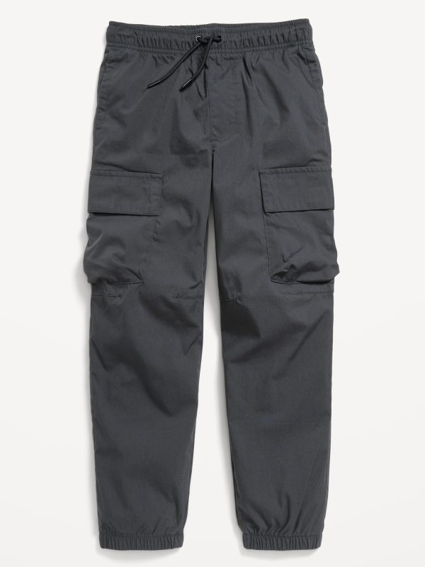 Baggy Cargo Pants for Boys: elasticized waist, functional drawstring, on-seam pockets, single welt pocket at back, adhesive secure-close cargo pocket at each leg, cinched leg cuffs, #565426
