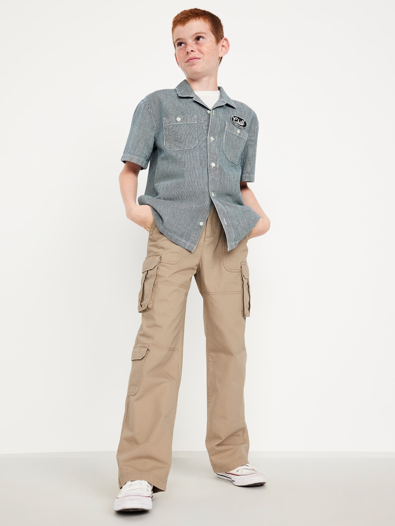 Baggy Cargo Ripstop Pants for Boys: interior adjustable waistband, regular button closure, zip fly, slanted side pockets, adhesive secure flap cargo pockets, patch pockets at back, #766354