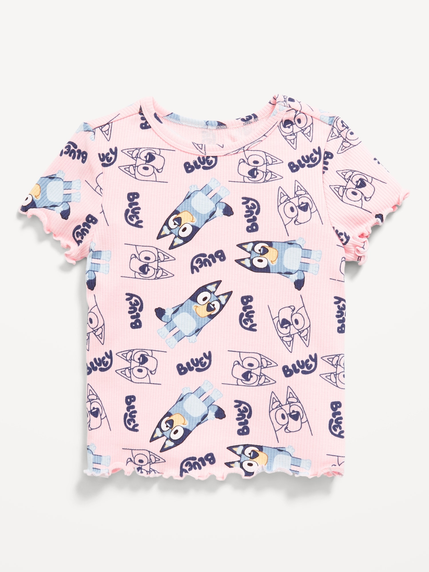 Bluey™ Ribbed Graphic T-Shirt for Toddler Girls: crew neck, short sleeves, licensed graphic, lettuce-edge cuffs and hem, BLUEY™ and character logo™ and © Ludo Studio. Licensed by BBC Studios Distribution Ltd., #725133