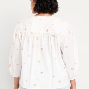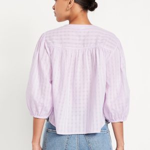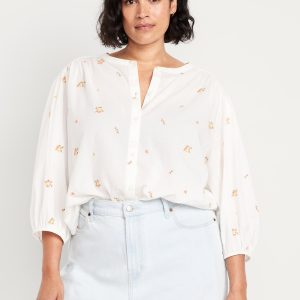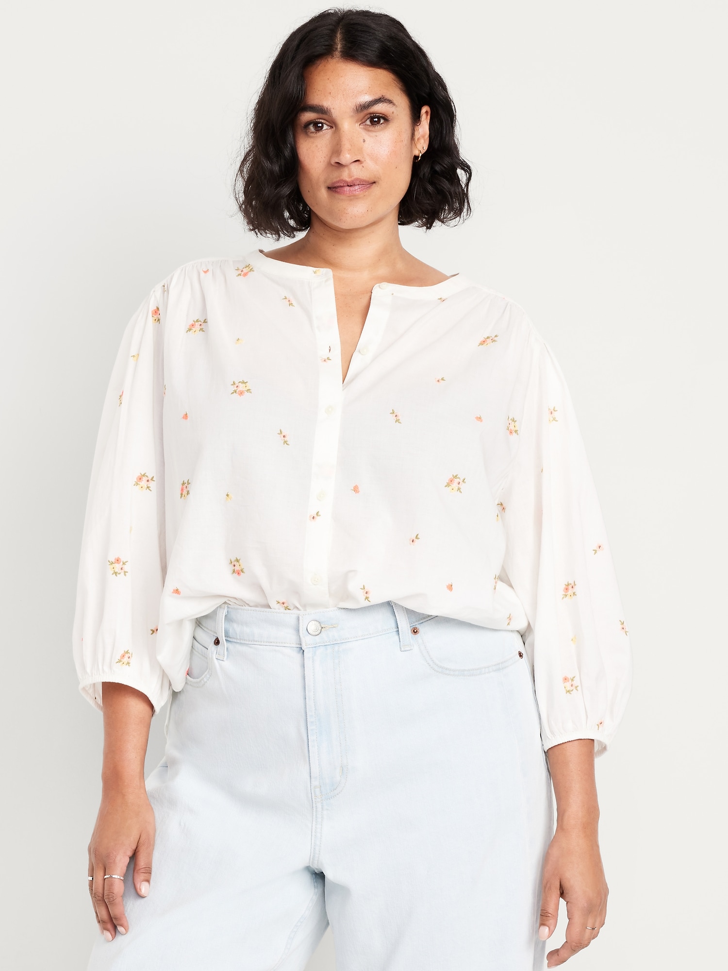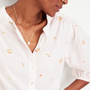 Button-Down Floral Shirt: banded collar, bracelet sleeves, elastic cuffs, full-button front, shirred detail, ditsy floral print, #704713