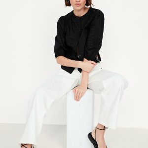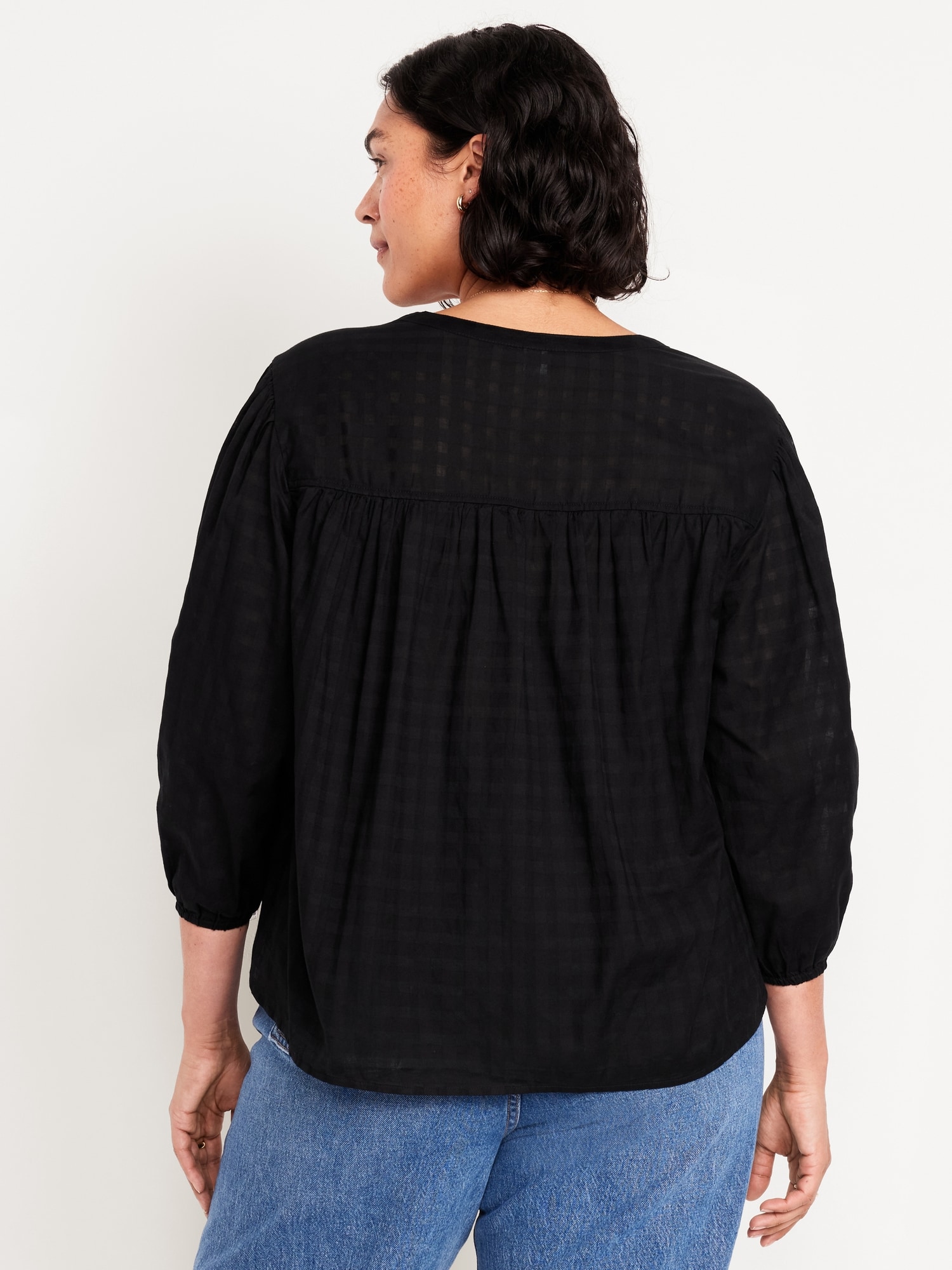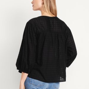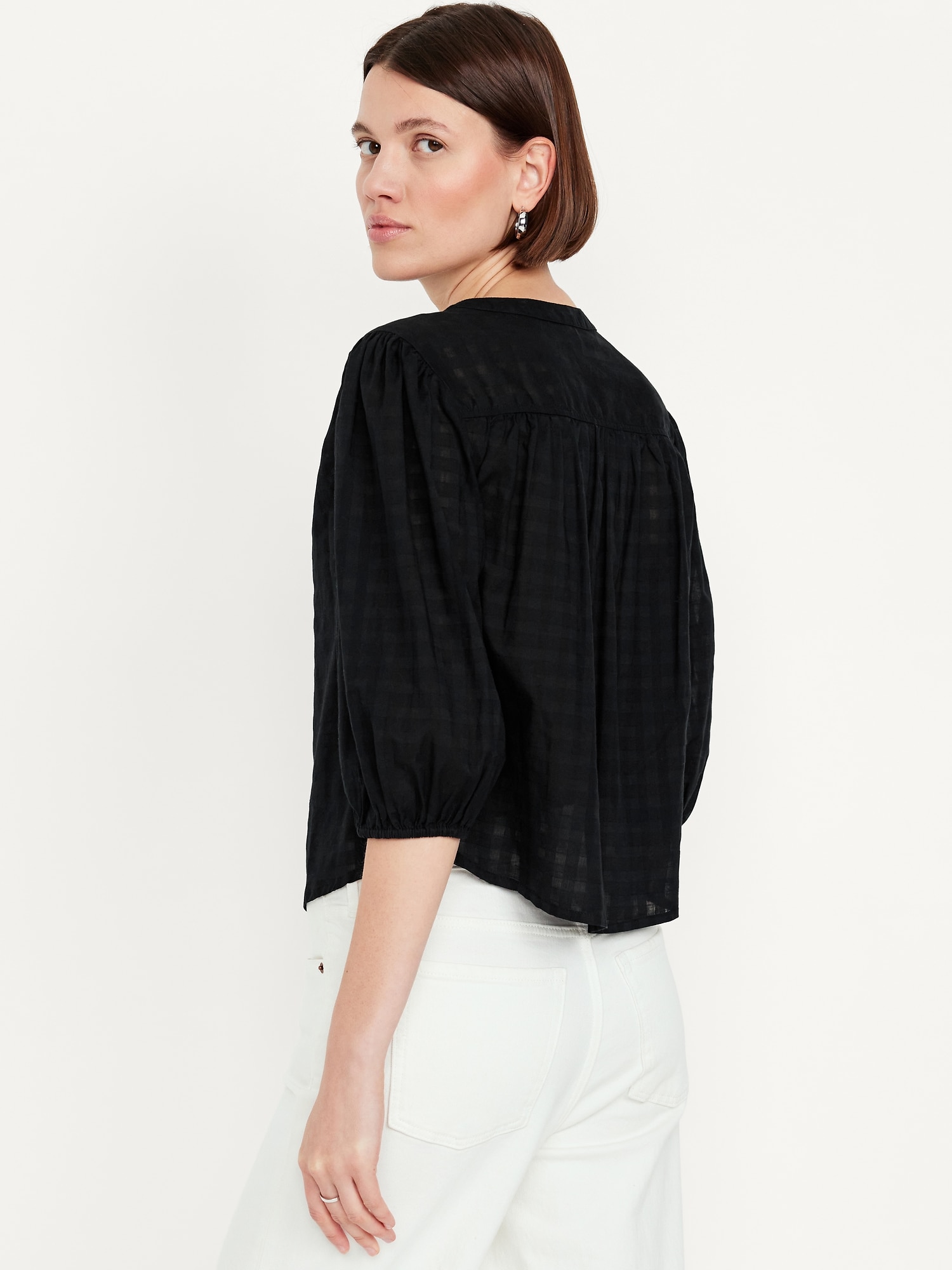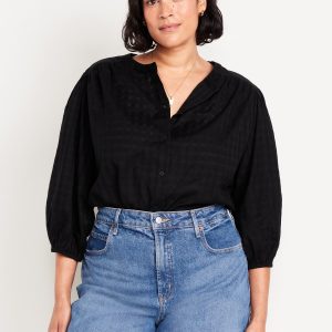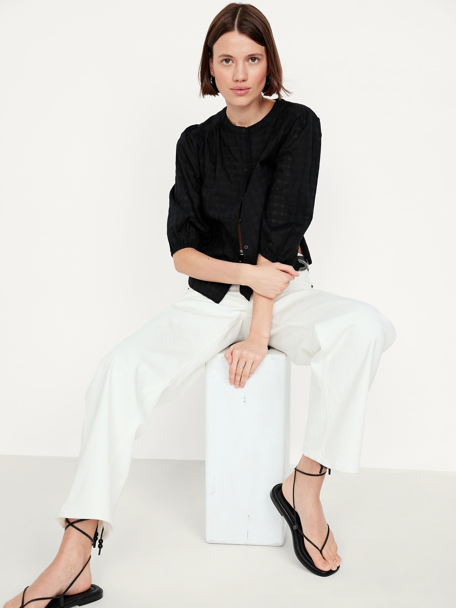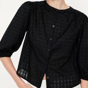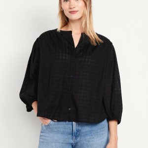 Button-Down Lightweight Dobby Shirt: banded collar, bracelet sleeves, elastic cuffs, full-button front, shirred detail, ditsy floral print, #704713