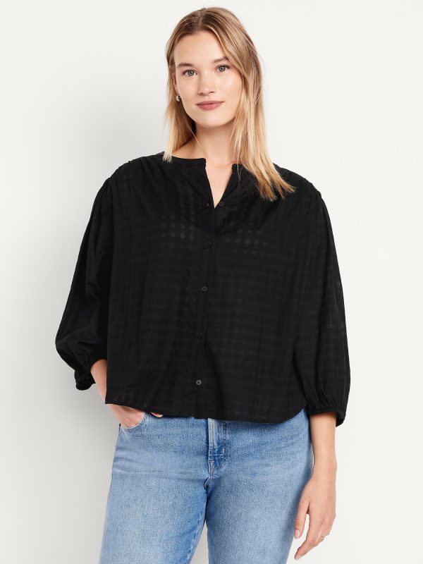 Button-Down Lightweight Dobby Shirt: banded collar, bracelet sleeves, elastic cuffs, full-button front, shirred detail, ditsy floral print, #704713