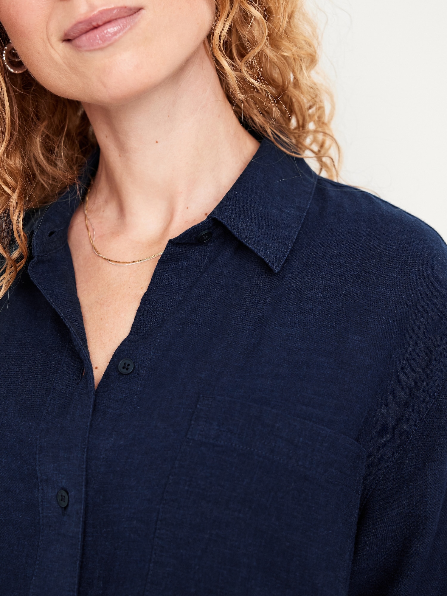 Button-Down Linen-Blend Striped Shirt: spread collar, long sleeves, buttoned cuffs, patch chest pocket, full-button front, striped print, curved hi-lo hem, #693623