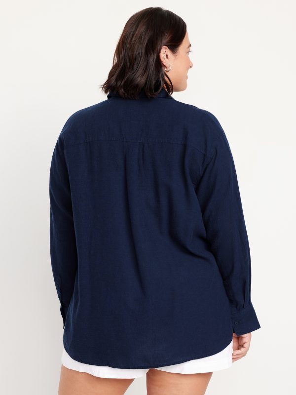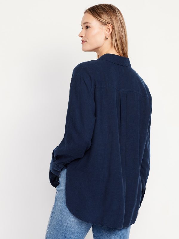 Button-Down Linen-Blend Striped Shirt: spread collar, long sleeves, buttoned cuffs, patch chest pocket, full-button front, striped print, curved hi-lo hem, #693623
