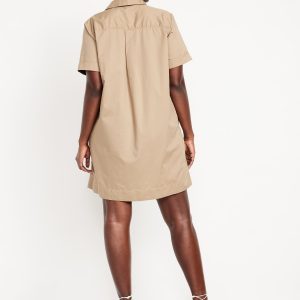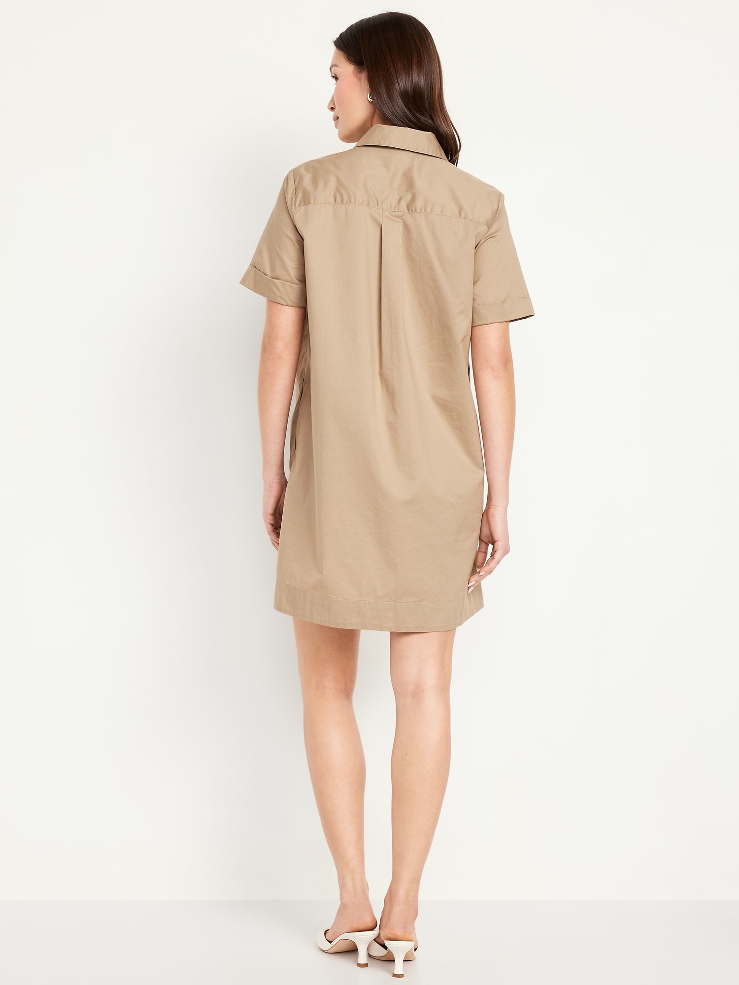 Button-Down Mini Shirt Dress: spread collar, short sleeves, side-seam pockets, patch chest pocket, full-button front, #705355