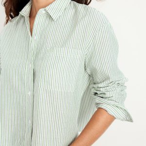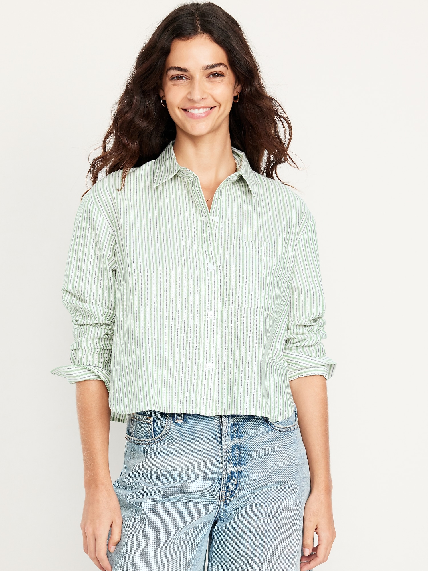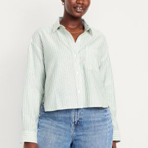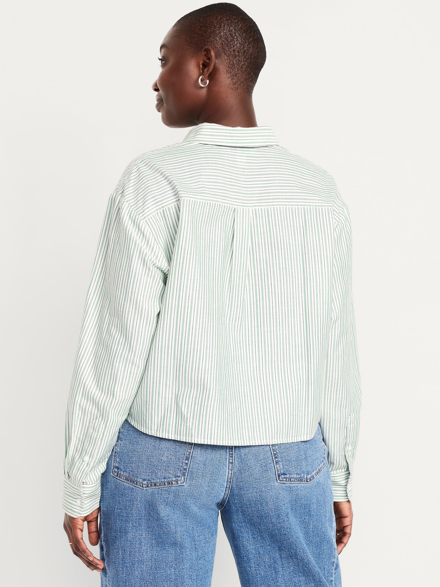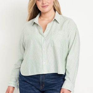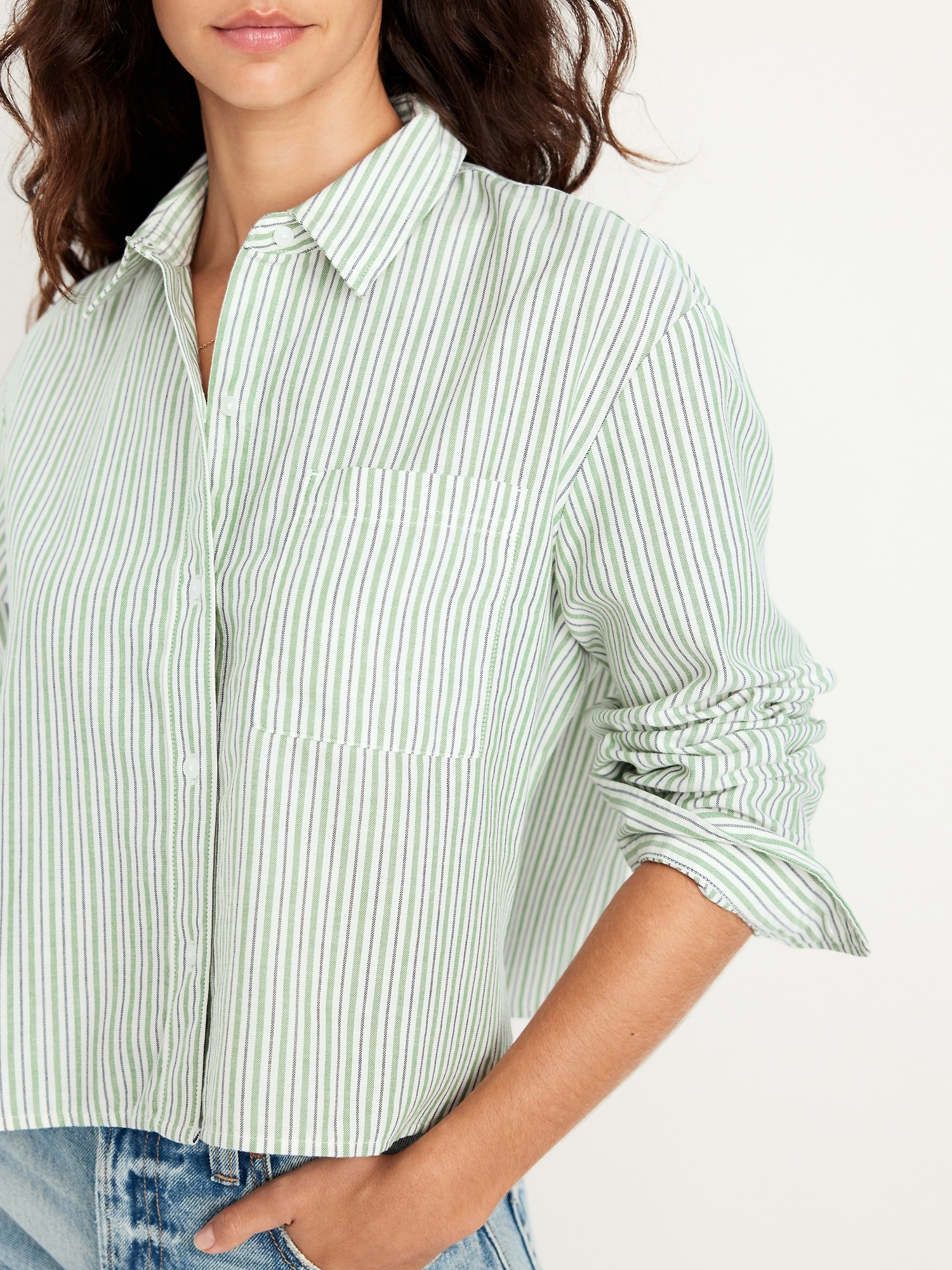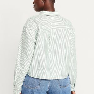 Button-Down Oxford Crop Shirt: spread collar, long sleeves with buttoned cuffs, full-button front, patch chest pocket, vertical striped print, #825106