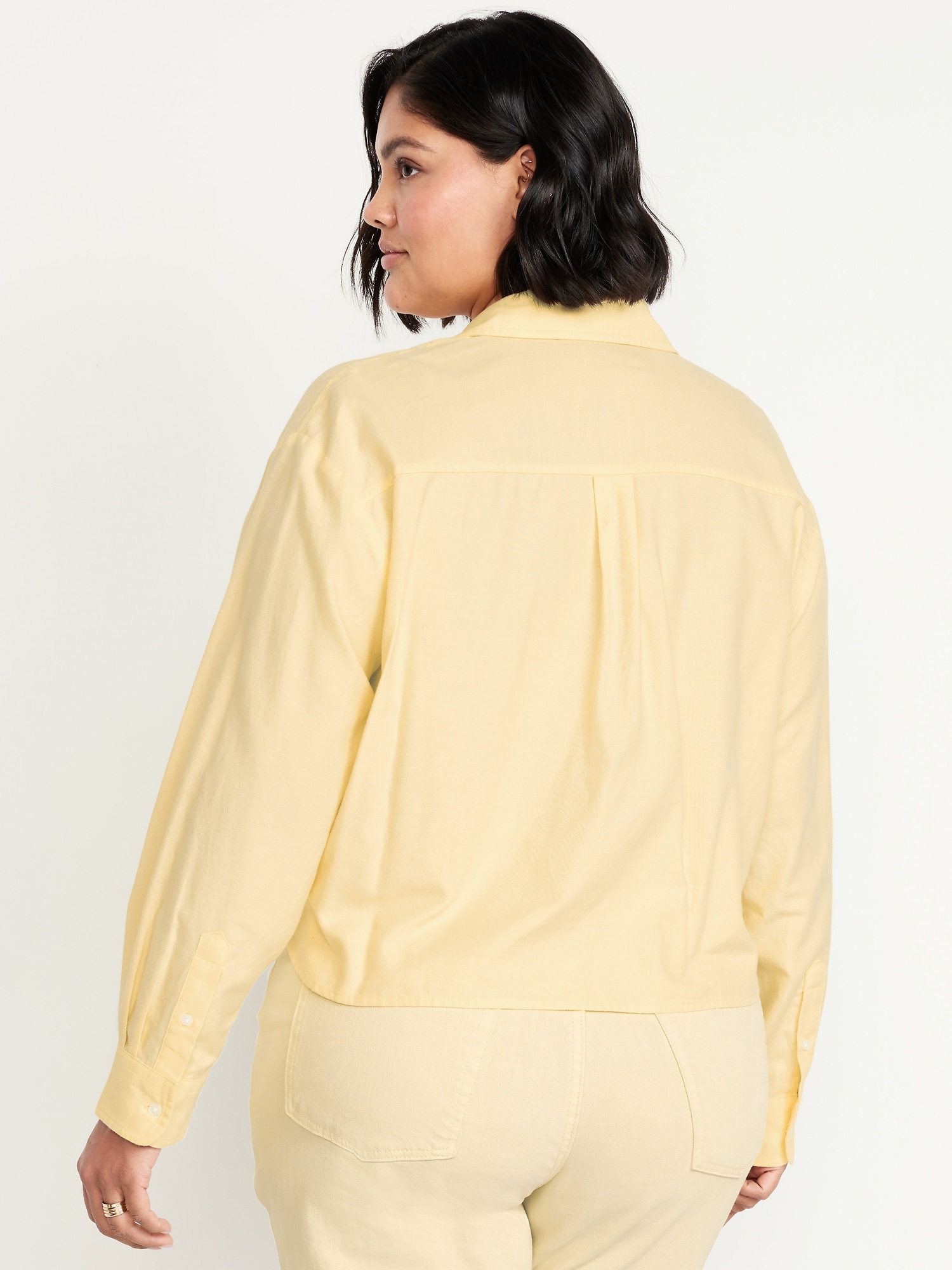 Button-Down Oxford Crop Shirt: spread collar, long sleeves with buttoned cuffs, full-button front, patch chest pocket, vertical striped print, #825106