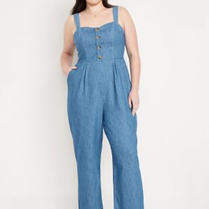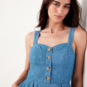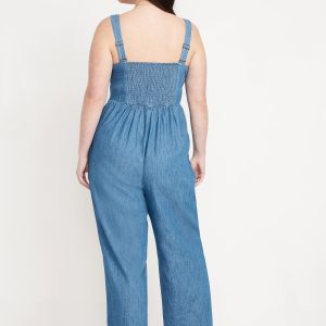 Button-Front Cami Jumpsuit: sweetheart neckline, wide adjustable straps, four-button front, hip pockets, smocked back, #681202