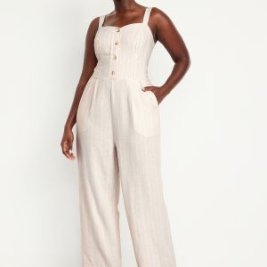 Button-Front Linen-Blend Cami Jumpsuit: sweetheart neckline, wide adjustable straps, four-button front, hip pockets, smocked back, #681202