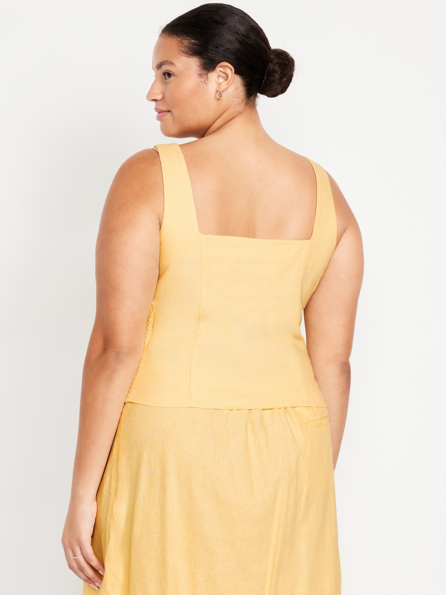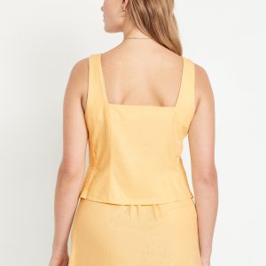 Button-Front Linen-Blend Vest: sweetheart neckline, wide straps, five-button front, smocked side panels, princess seams, #704063
