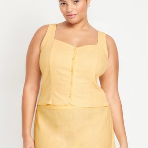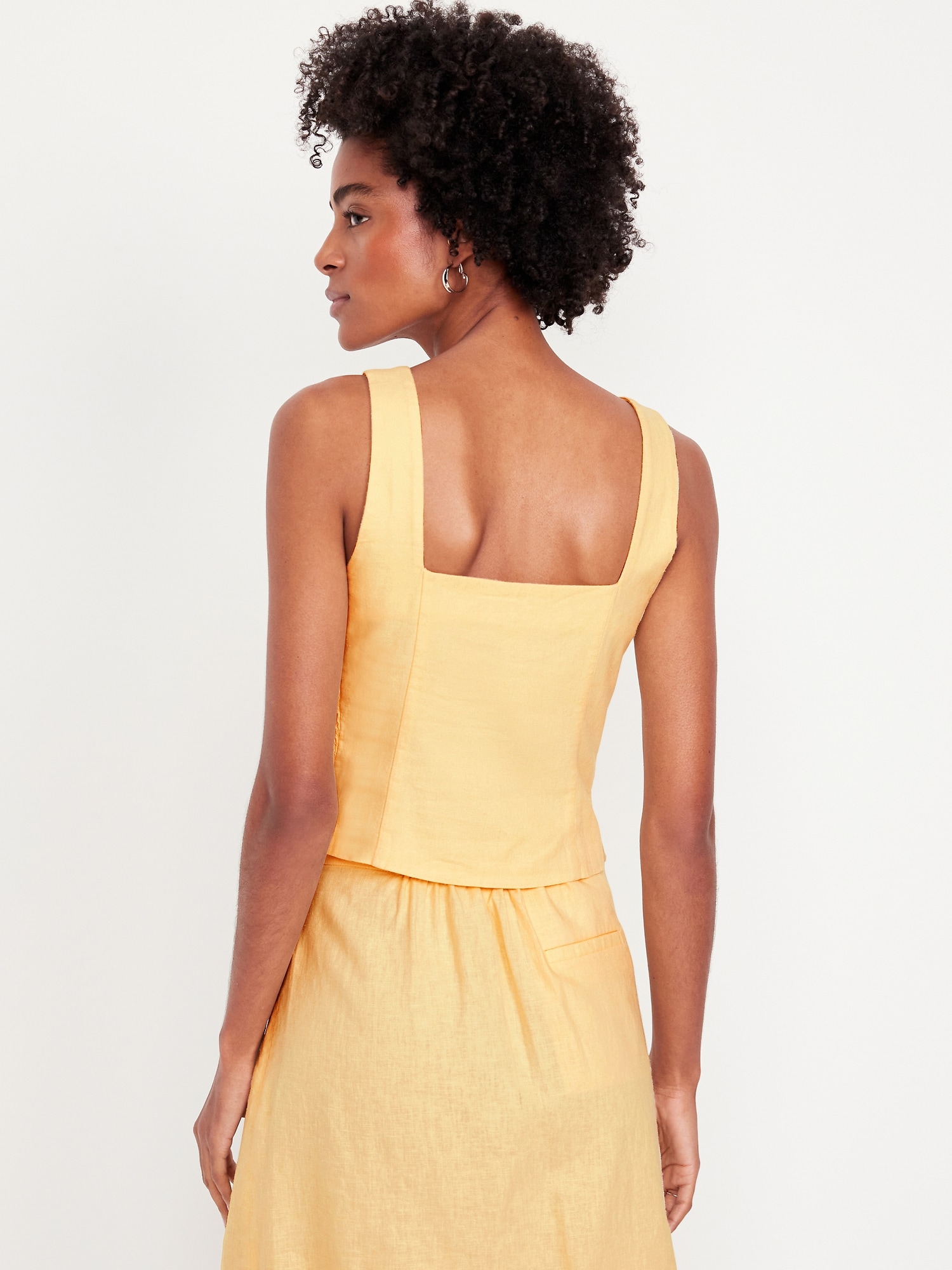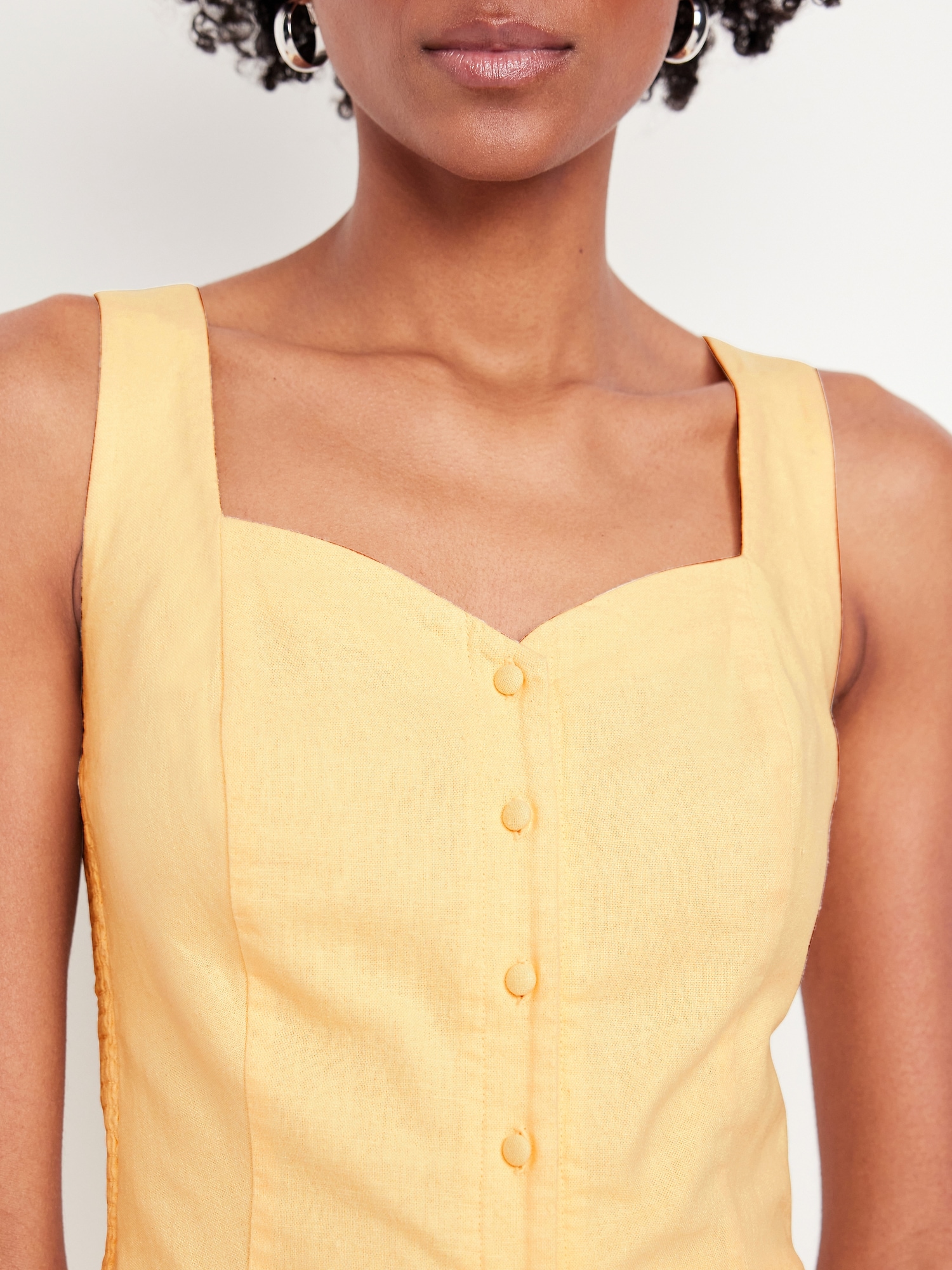 Button-Front Linen-Blend Vest: sweetheart neckline, wide straps, five-button front, smocked side panels, princess seams, striped print, #704099