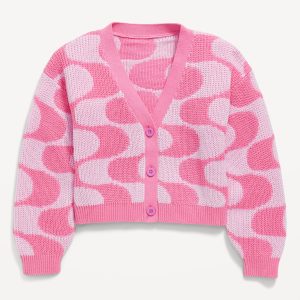 Button-Front Ribbed Cardigan for Girls: v neck, heart shaped button loop closures, long sleeves, lettuce edge cuffs and hem, #766942