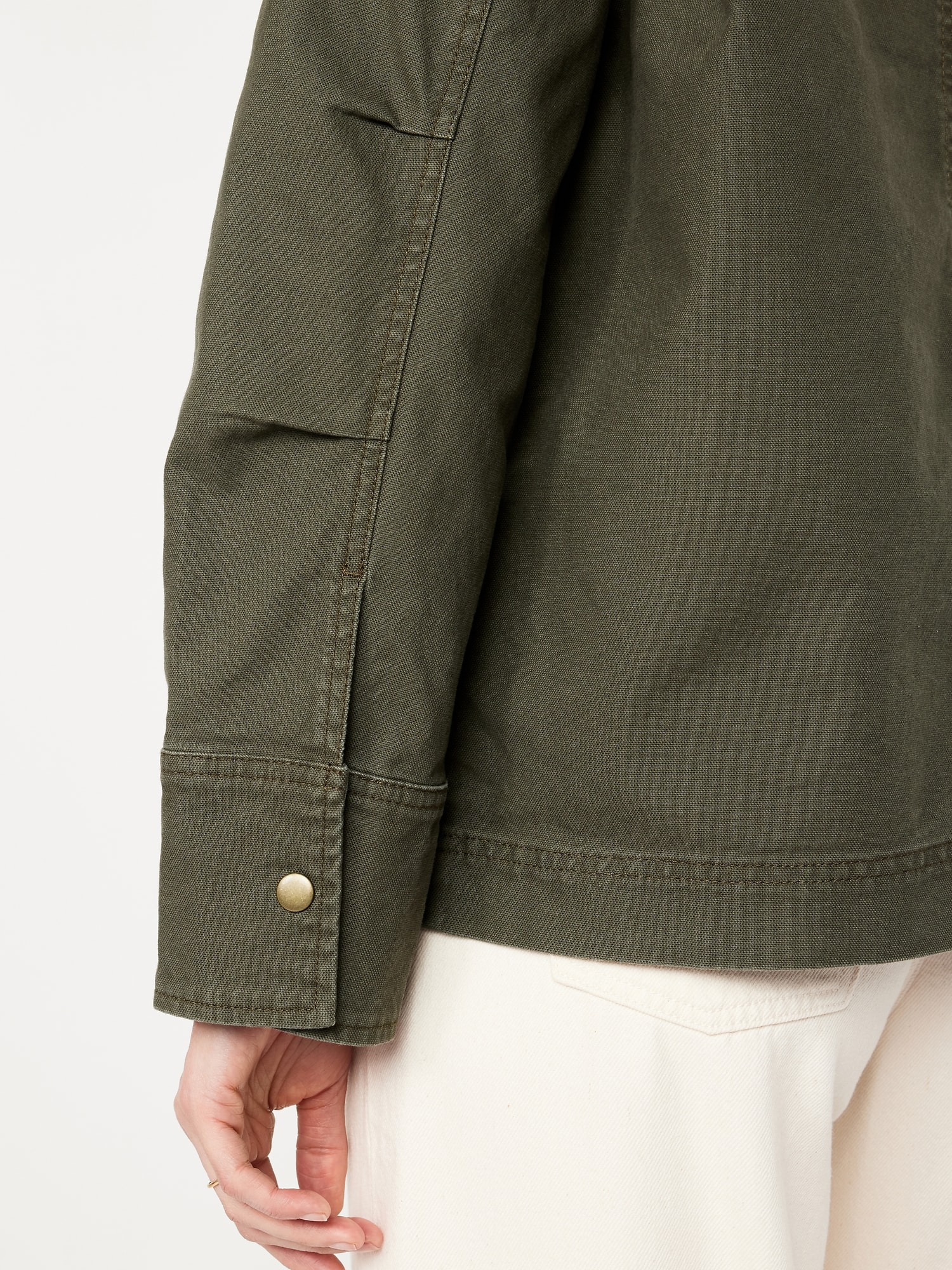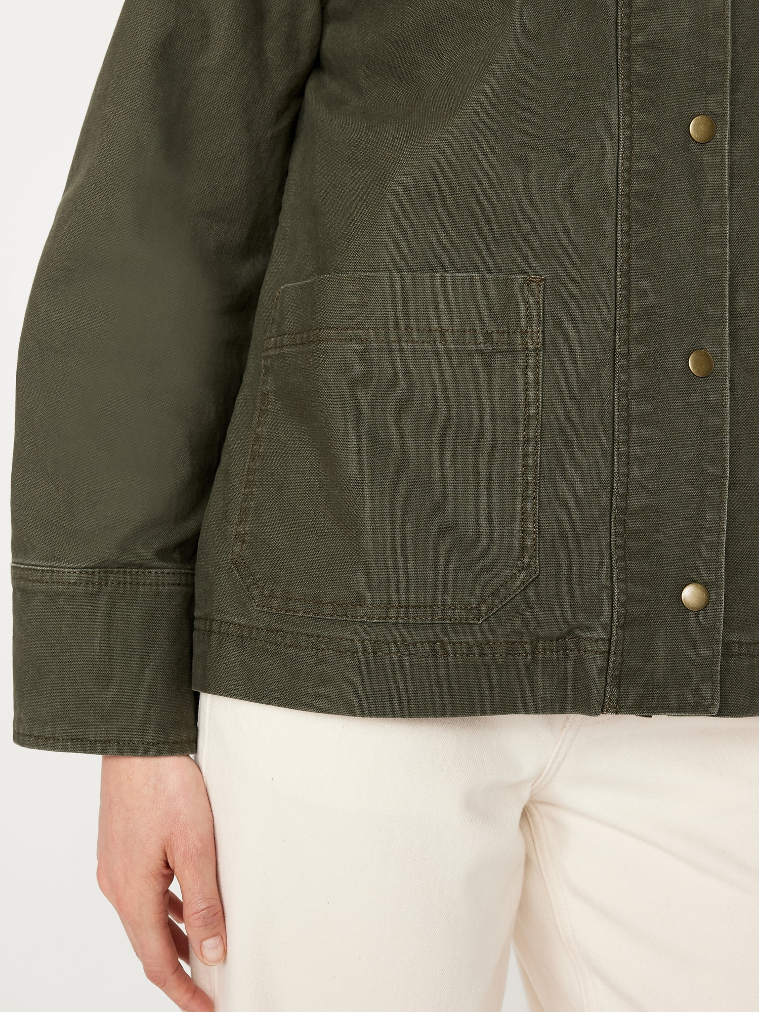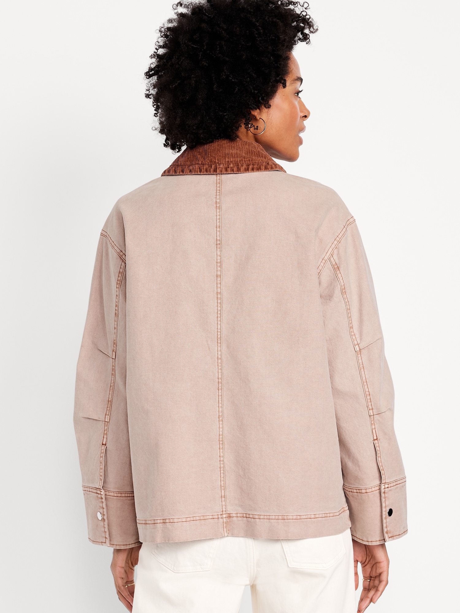 Canvas Barn Jacket: corduroy collar, long sleeves with snap cuffs, full-snap front with hidden zipper, patch pockets, #766357