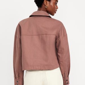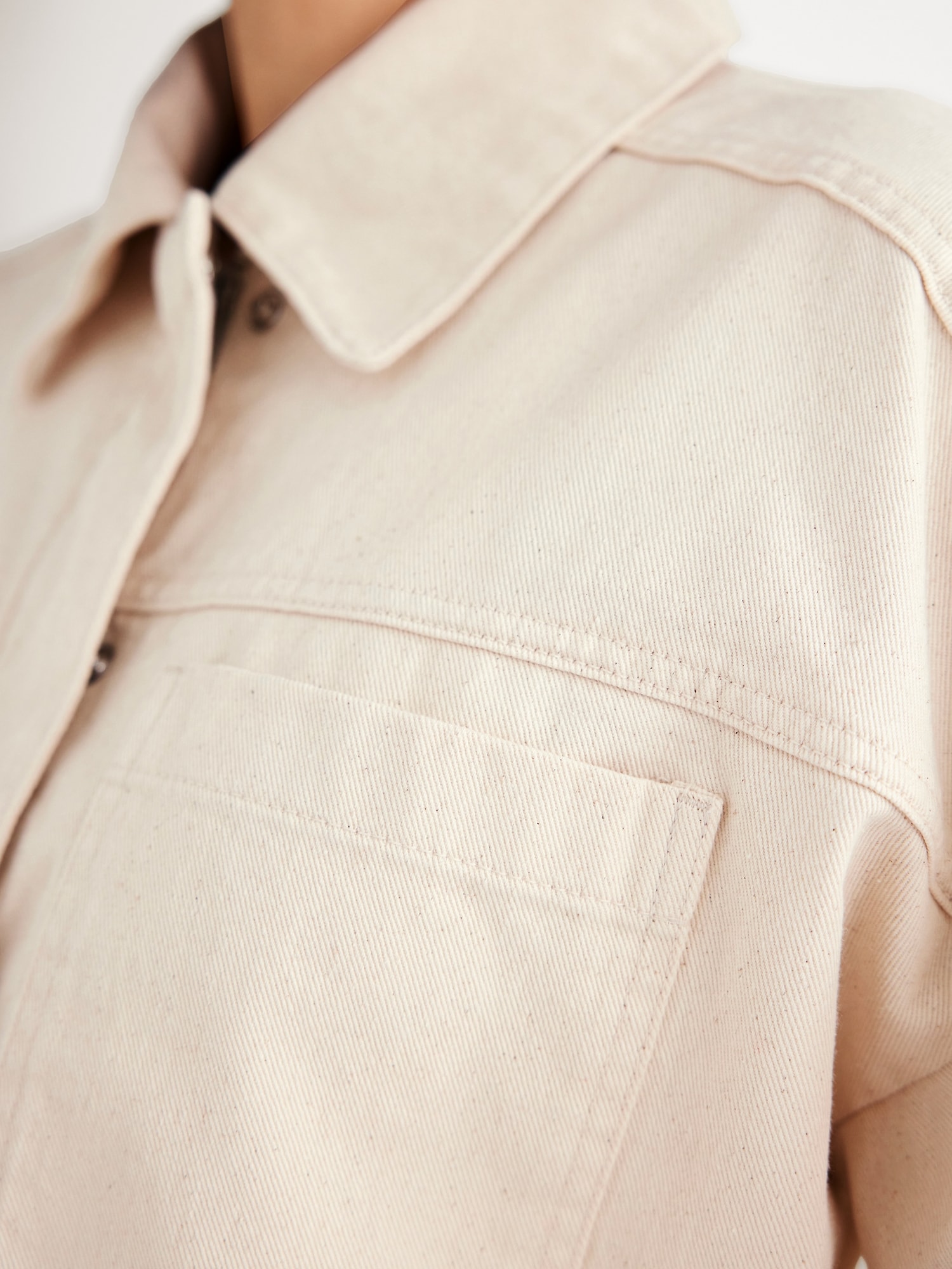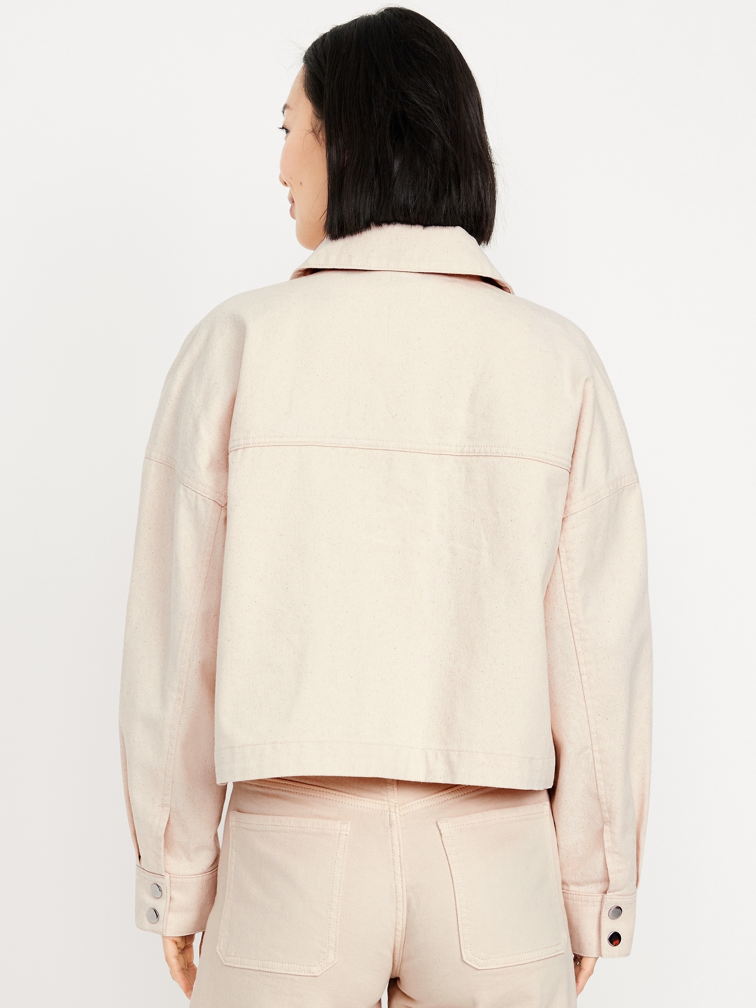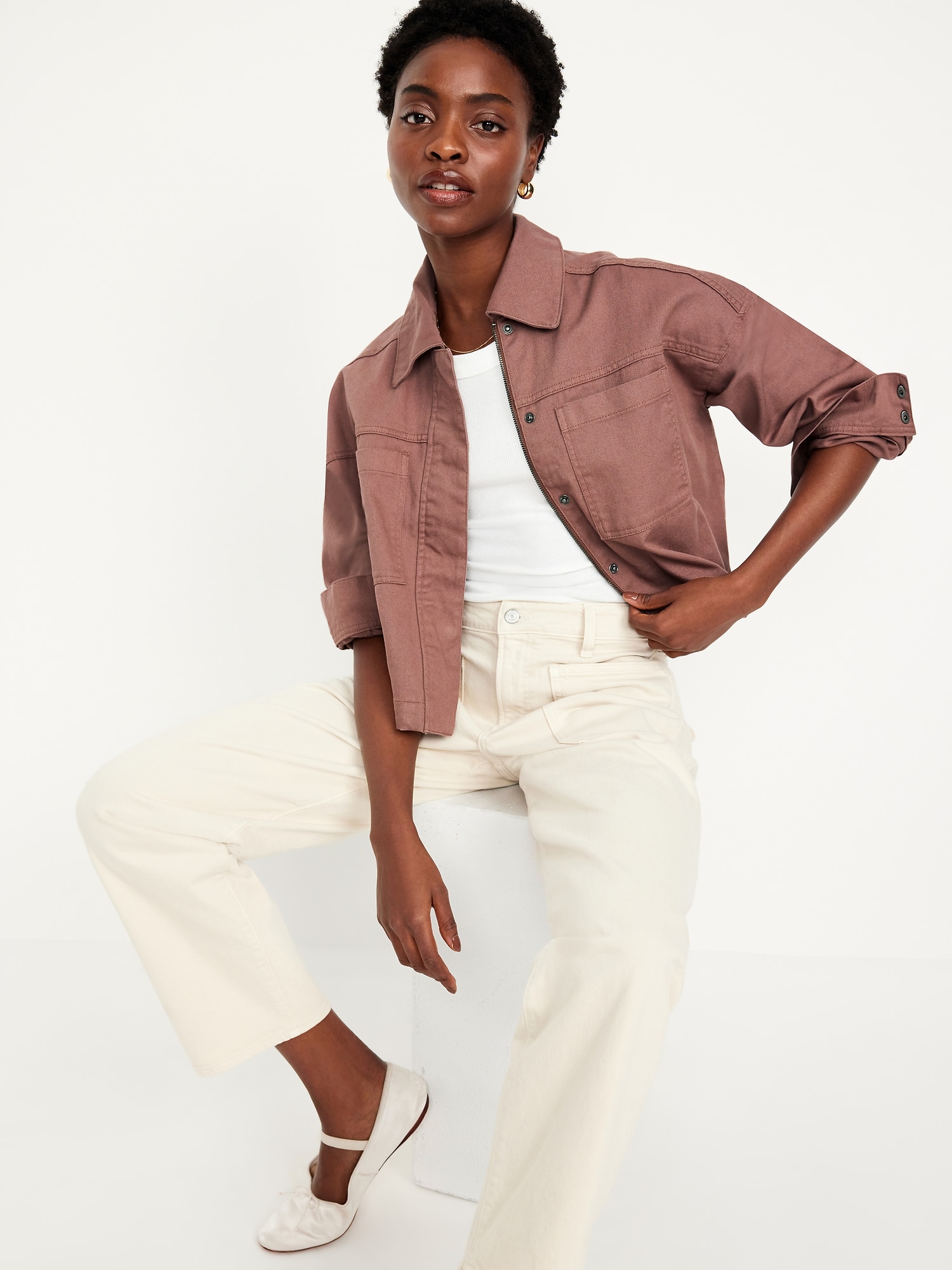 Canvas Crop Utility Jacket: spread collar, long sleeves, snap cuffs, snap front, patch chest pockets, seamed yoke, #663795