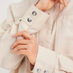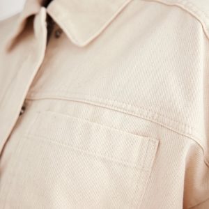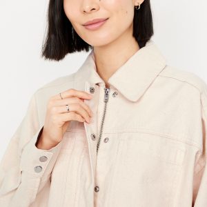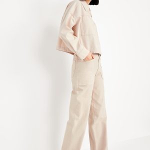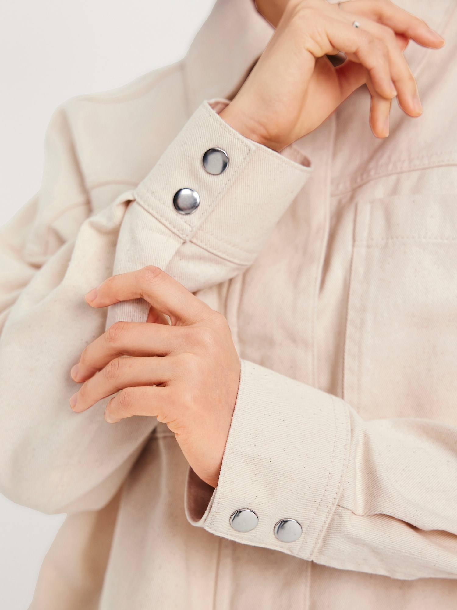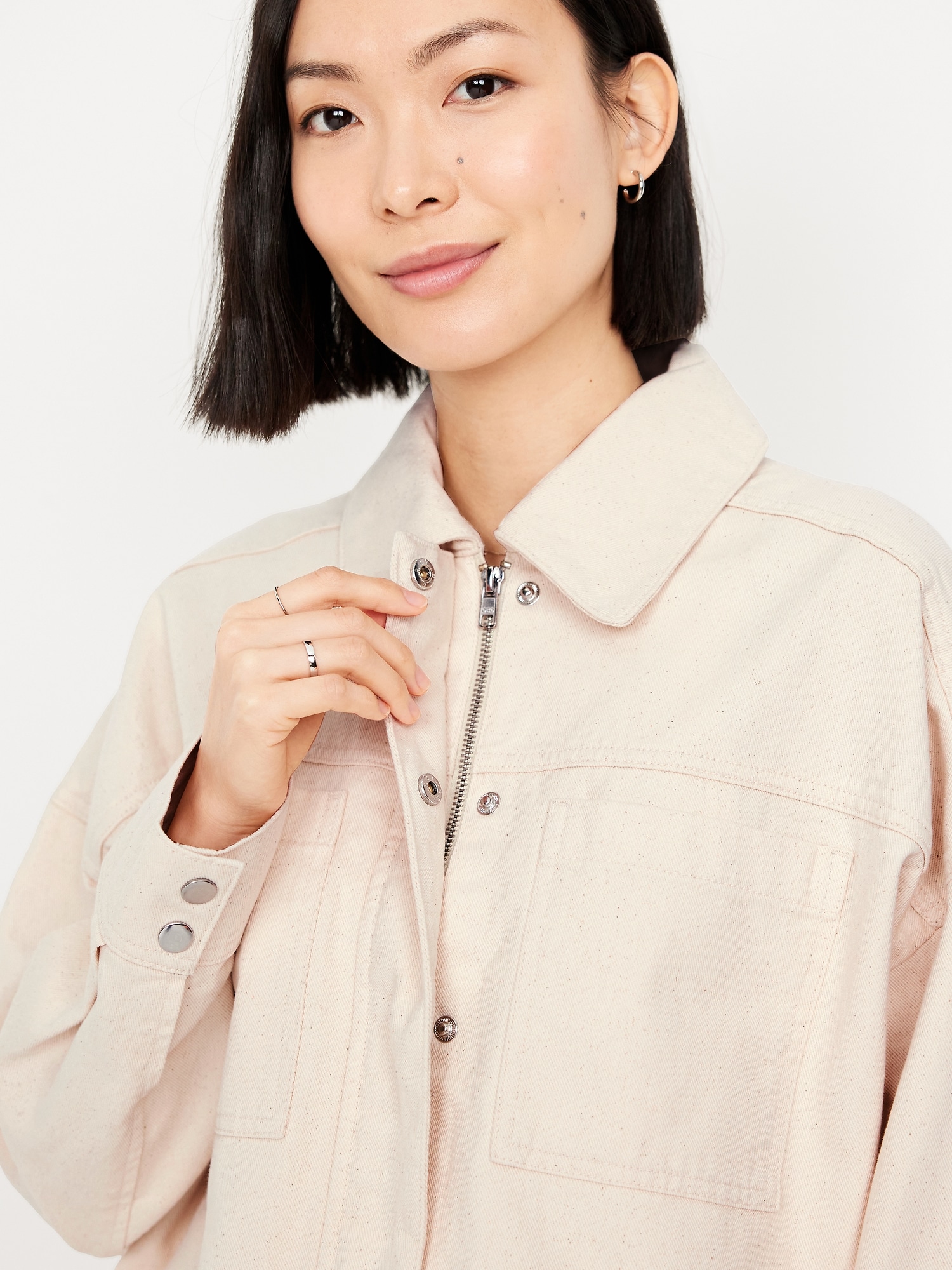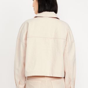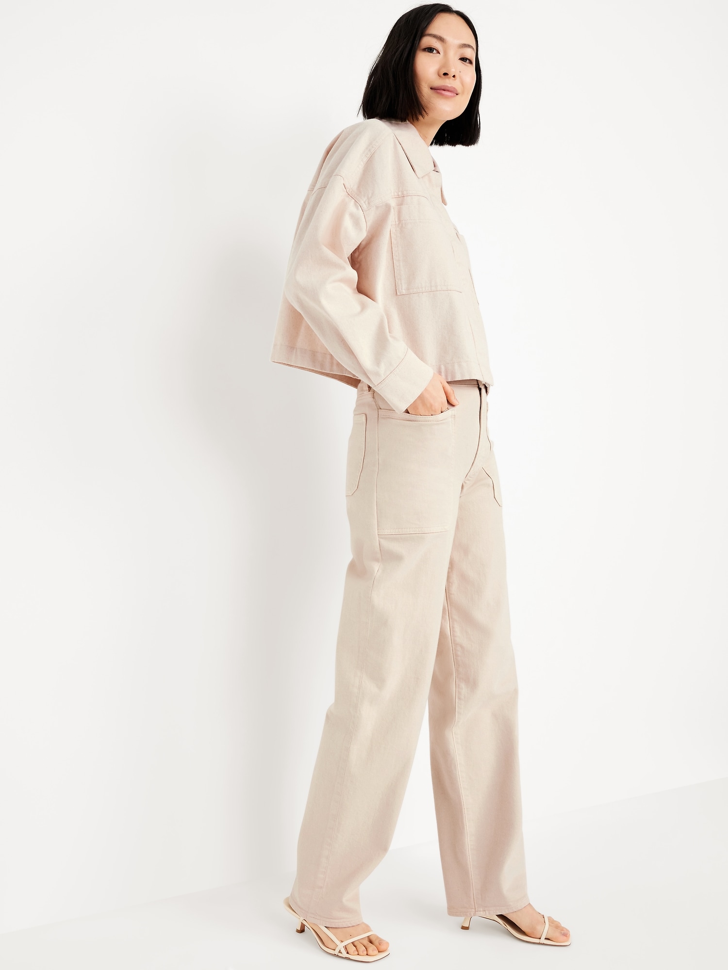 Canvas Crop Utility Jacket: spread collar, long sleeves, snap cuffs, snap front, patch chest pockets, seamed yoke, #663795
