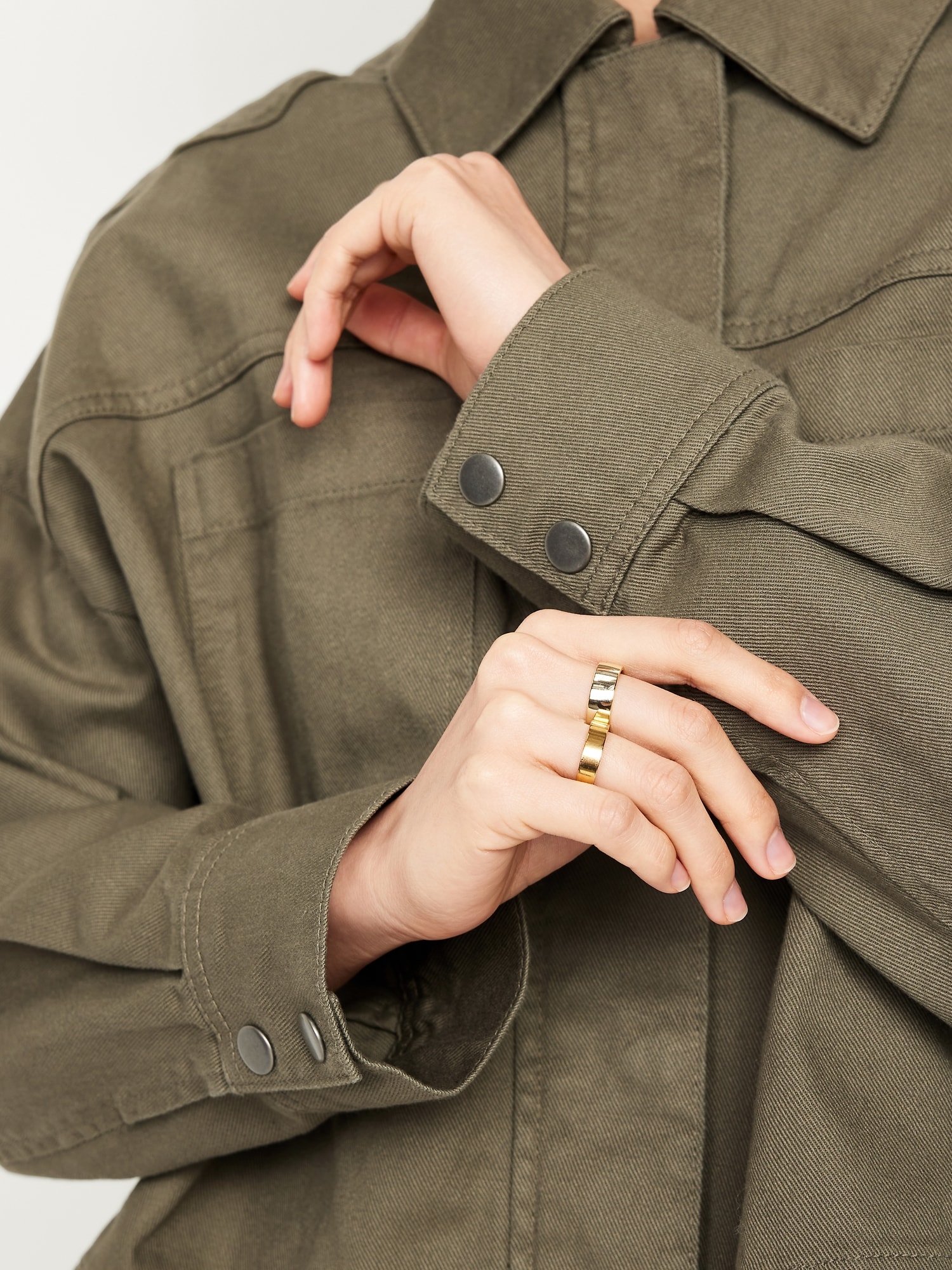 Canvas Crop Utility Jacket: spread collar, long sleeves, snap cuffs, snap front, patch chest pockets, seamed yoke, #663795