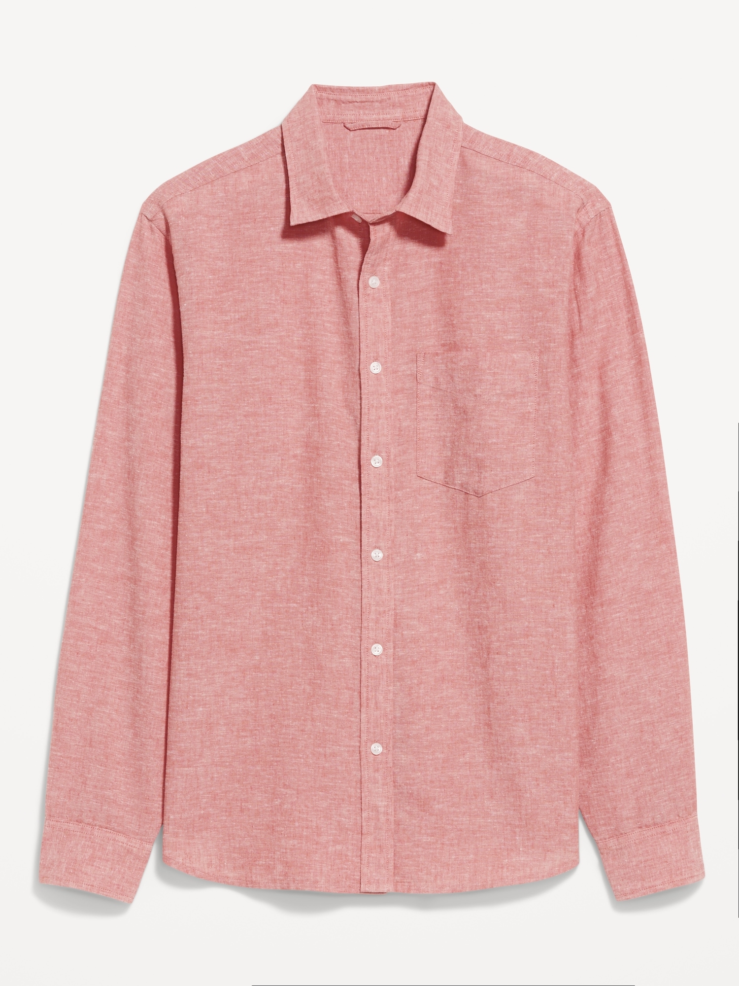 Classic Fit Linen-Blend Shirt: spread collar, long sleeves, buttoned cuffs, full-button front, patch chest pocket, #691163