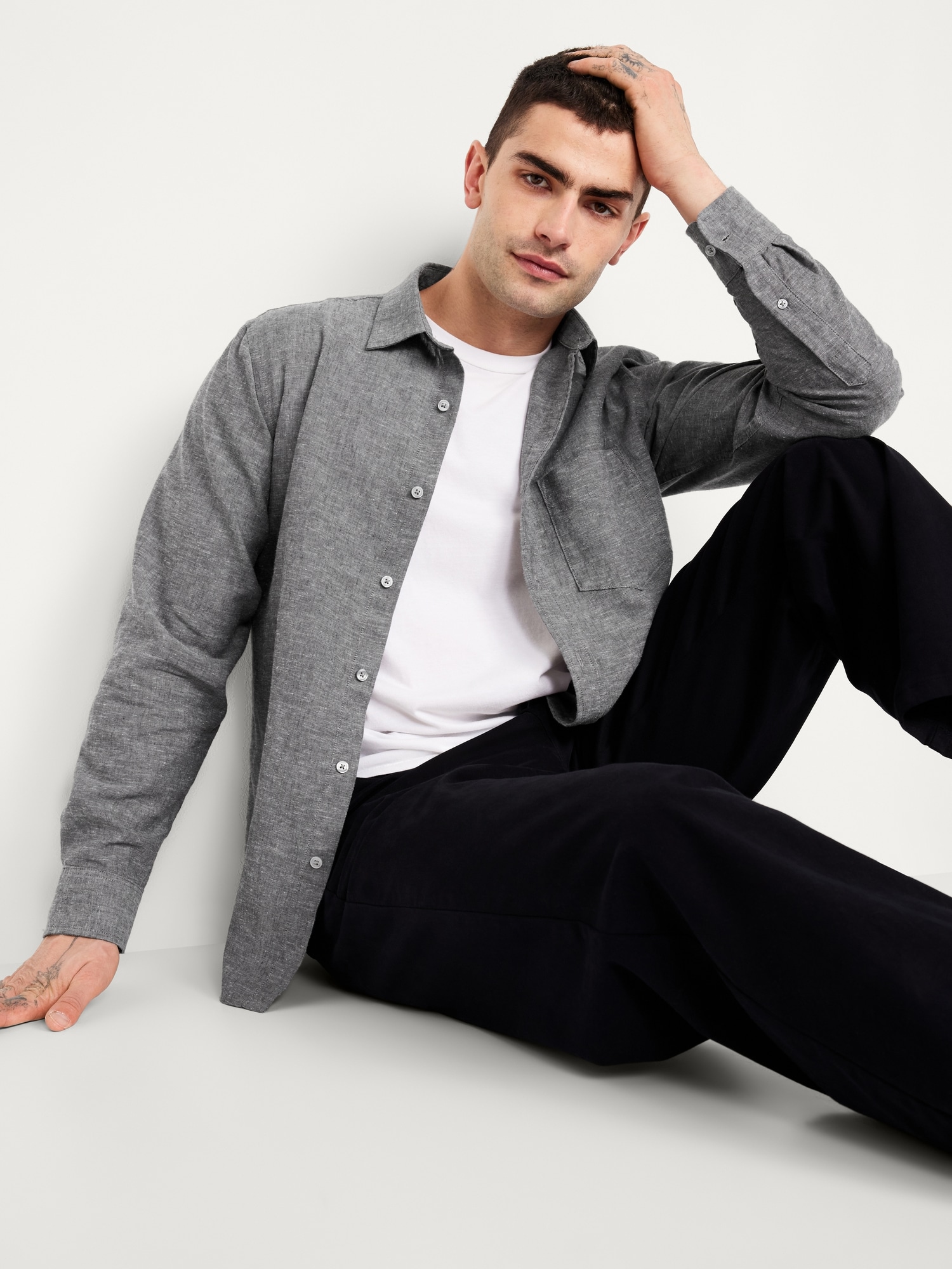 Classic Fit Linen-Blend Shirt: spread collar, long sleeves, buttoned cuffs, full-button front, patch chest pocket, #691163