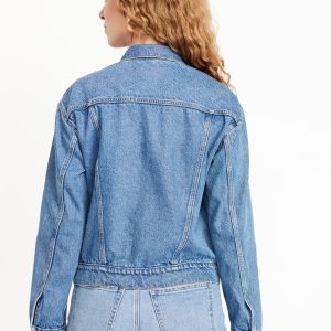 Classic Jean Jacket: spread collar, long sleeves, buttoned cuffs, flap-button chest pockets, on-seam front pockets, full-button front, banded hem, adjustable button tabs at back waist, #467752