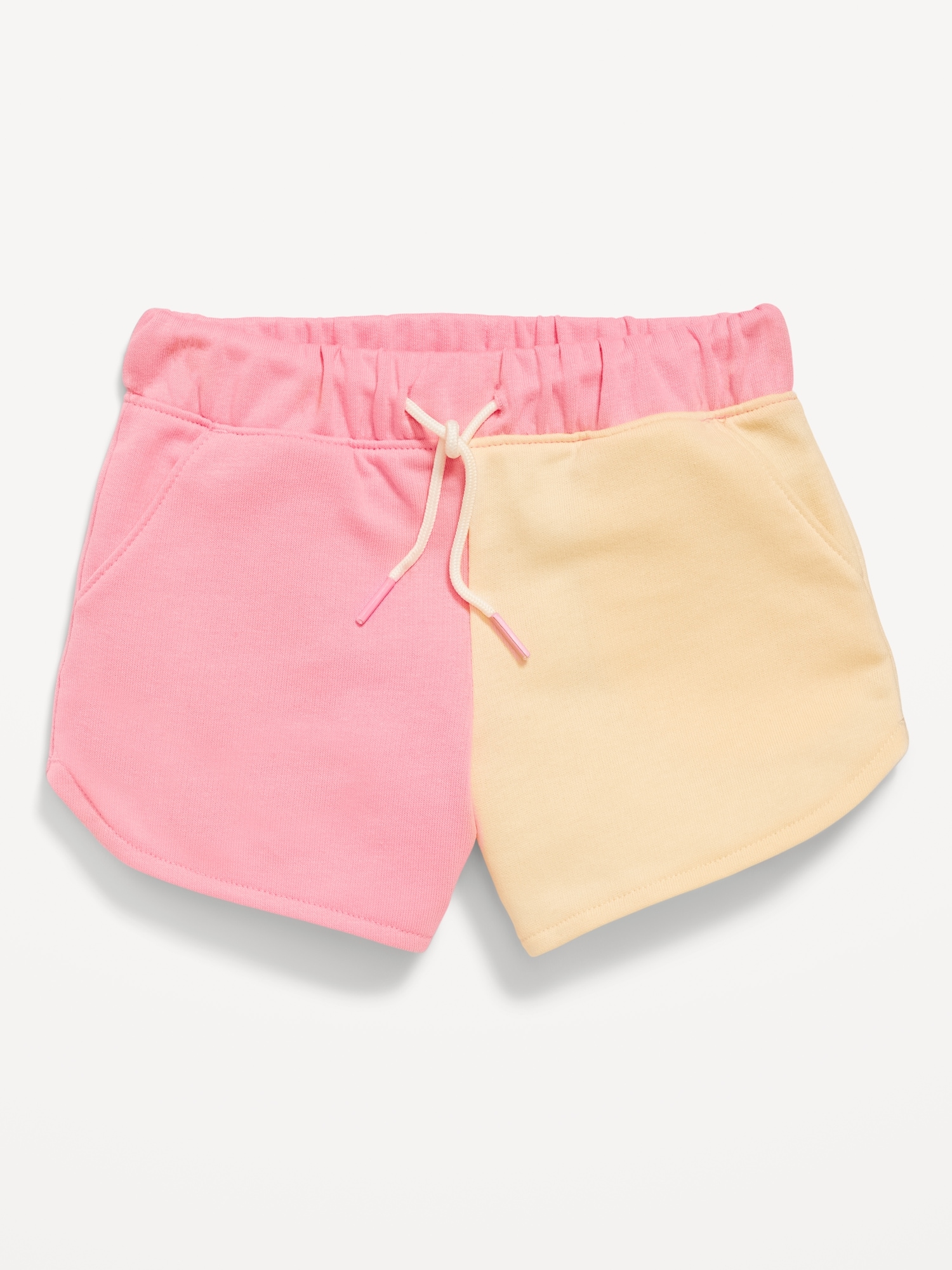 Color-Block Graphic French-Terry Shorts for Toddler Girls: elasticized waistband, functional drawstring, diagonal on-seam pockets, small-scale logo graphic, dolphin hem, #690582