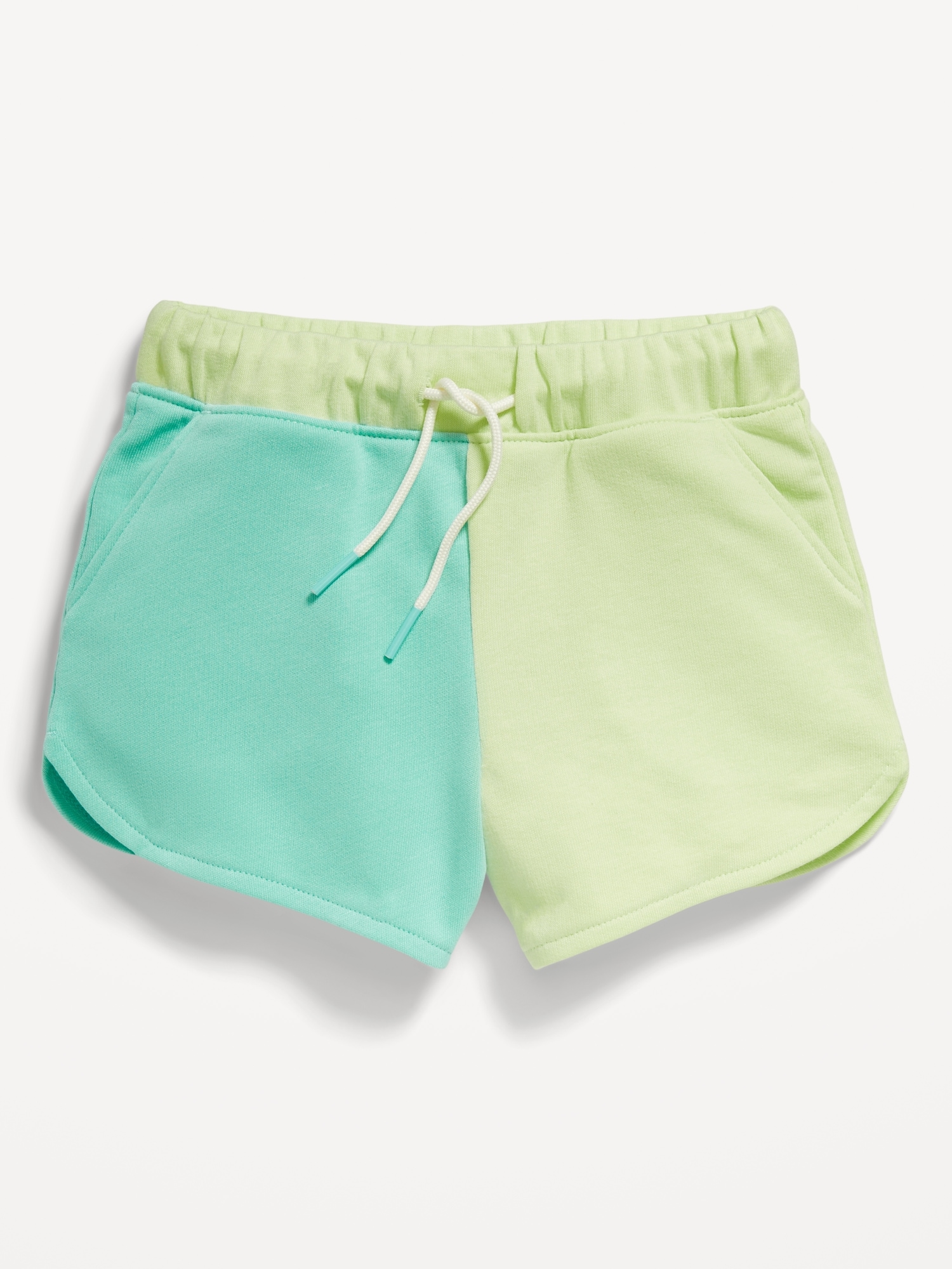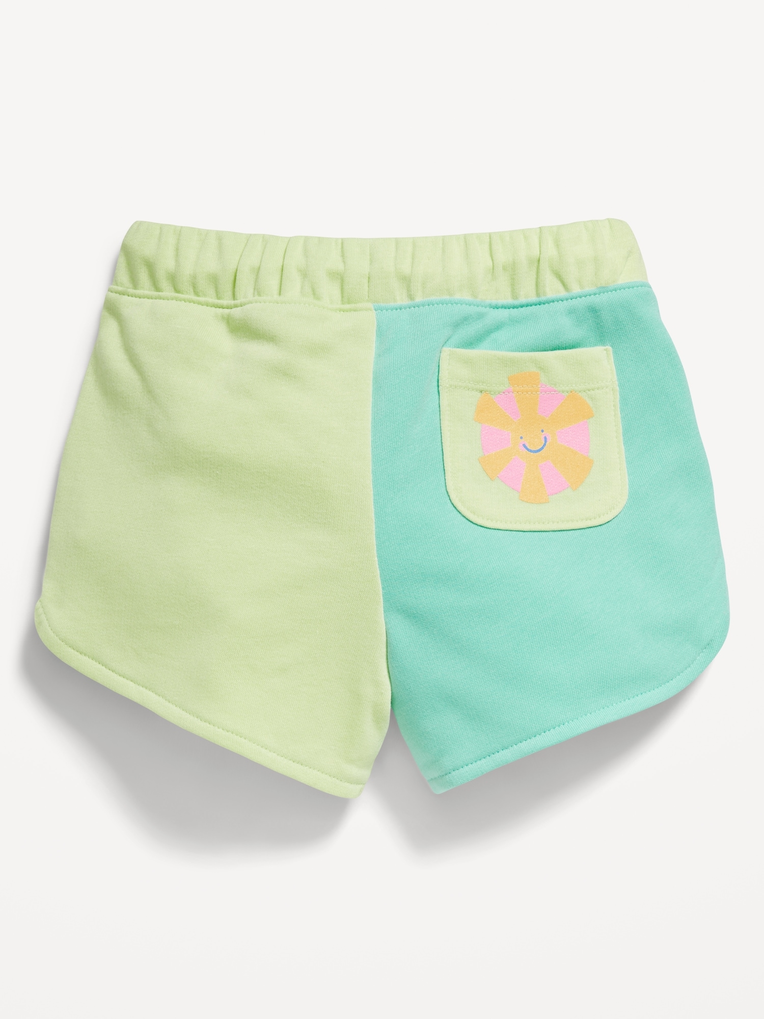 Color-Block Graphic French-Terry Shorts for Toddler Girls: elasticized waistband, functional drawstring, diagonal on-seam pockets, small-scale logo graphic, dolphin hem, #690582