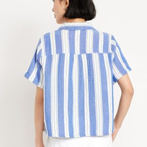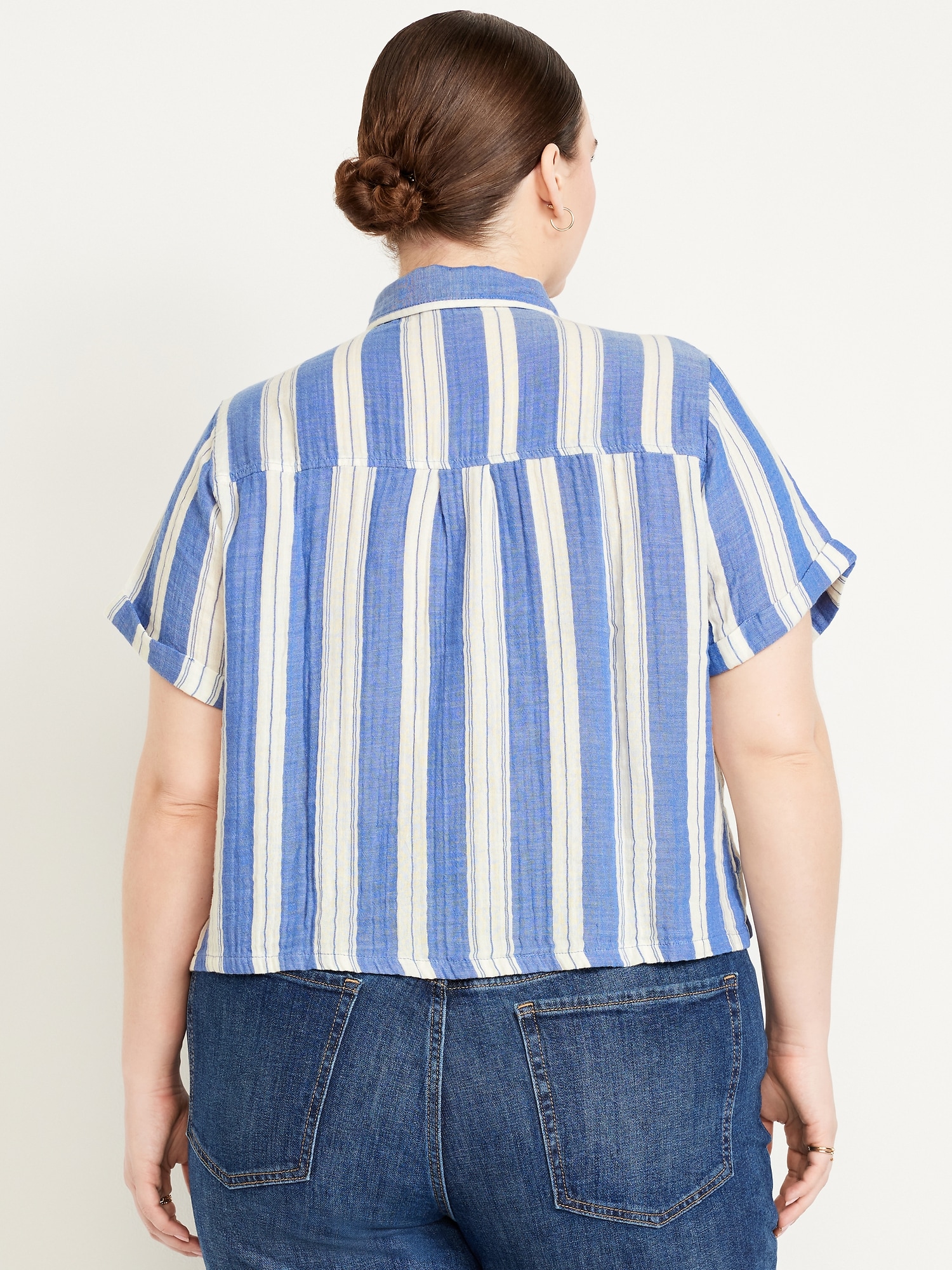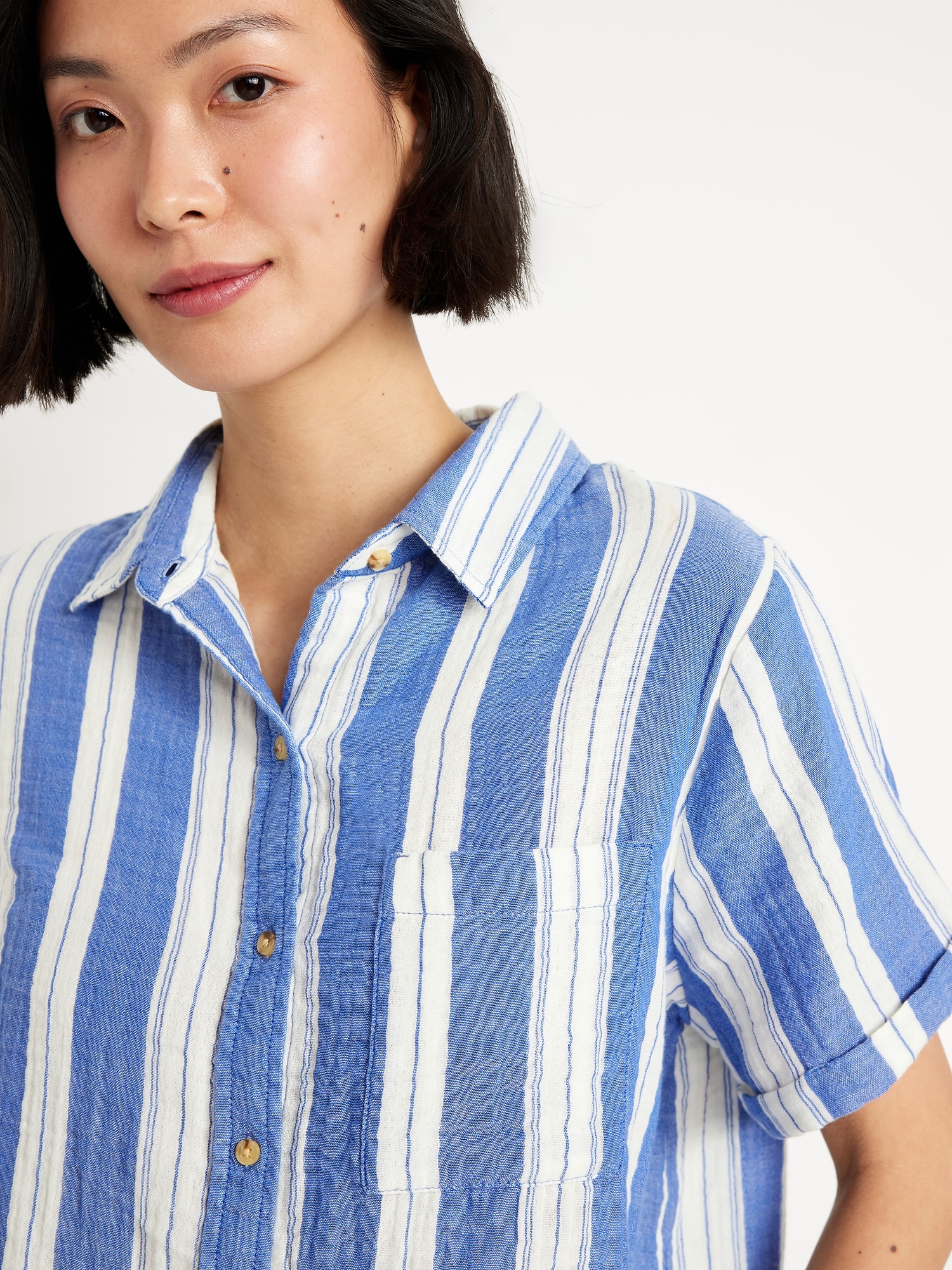 Crinkle Gauze Button-Down Striped Shirt: Drapey, laid-back and ready for the breeze.spread collar, short sleeves, full-button front, seamed back yoke, #704203