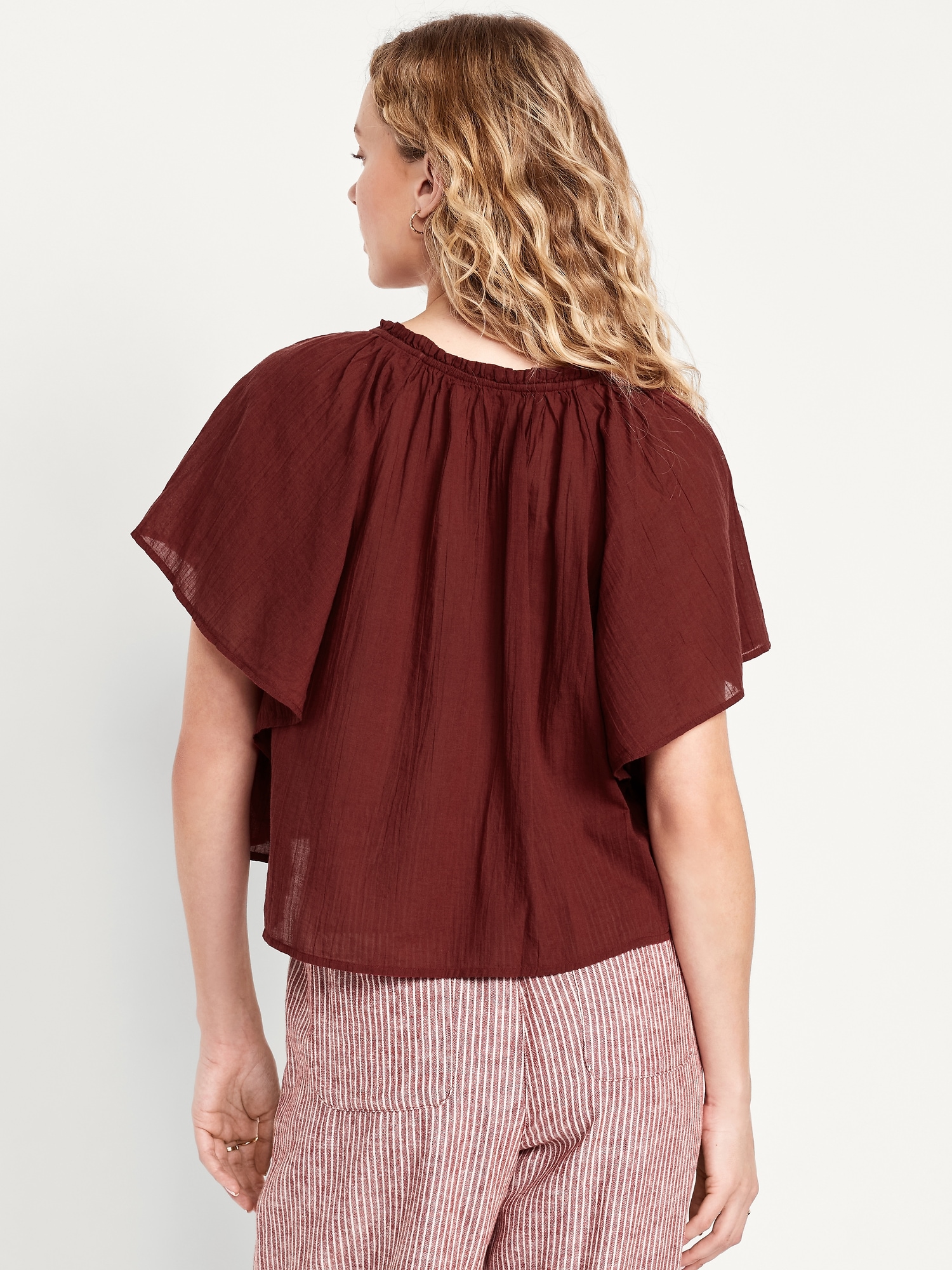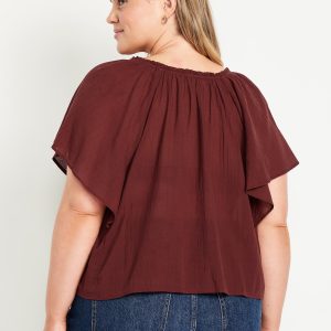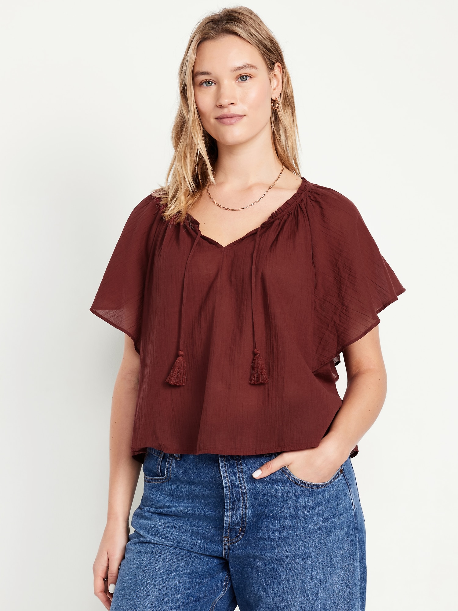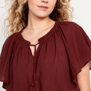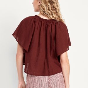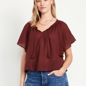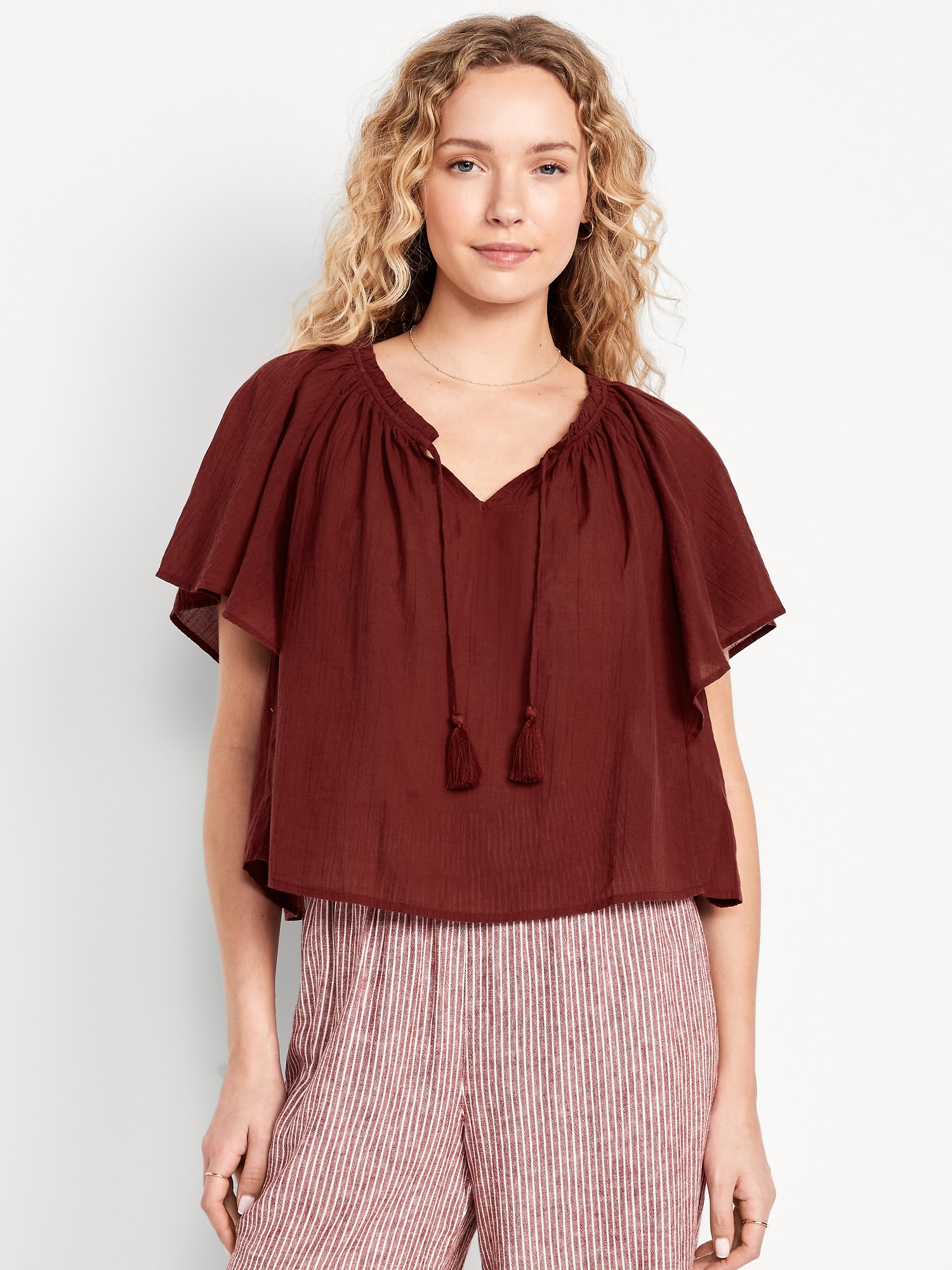 Crinkle Gauze Tassel-Tie Shirred Top: v-neck tassel-tie front, short flutter sleeves, shirred detail, #764192