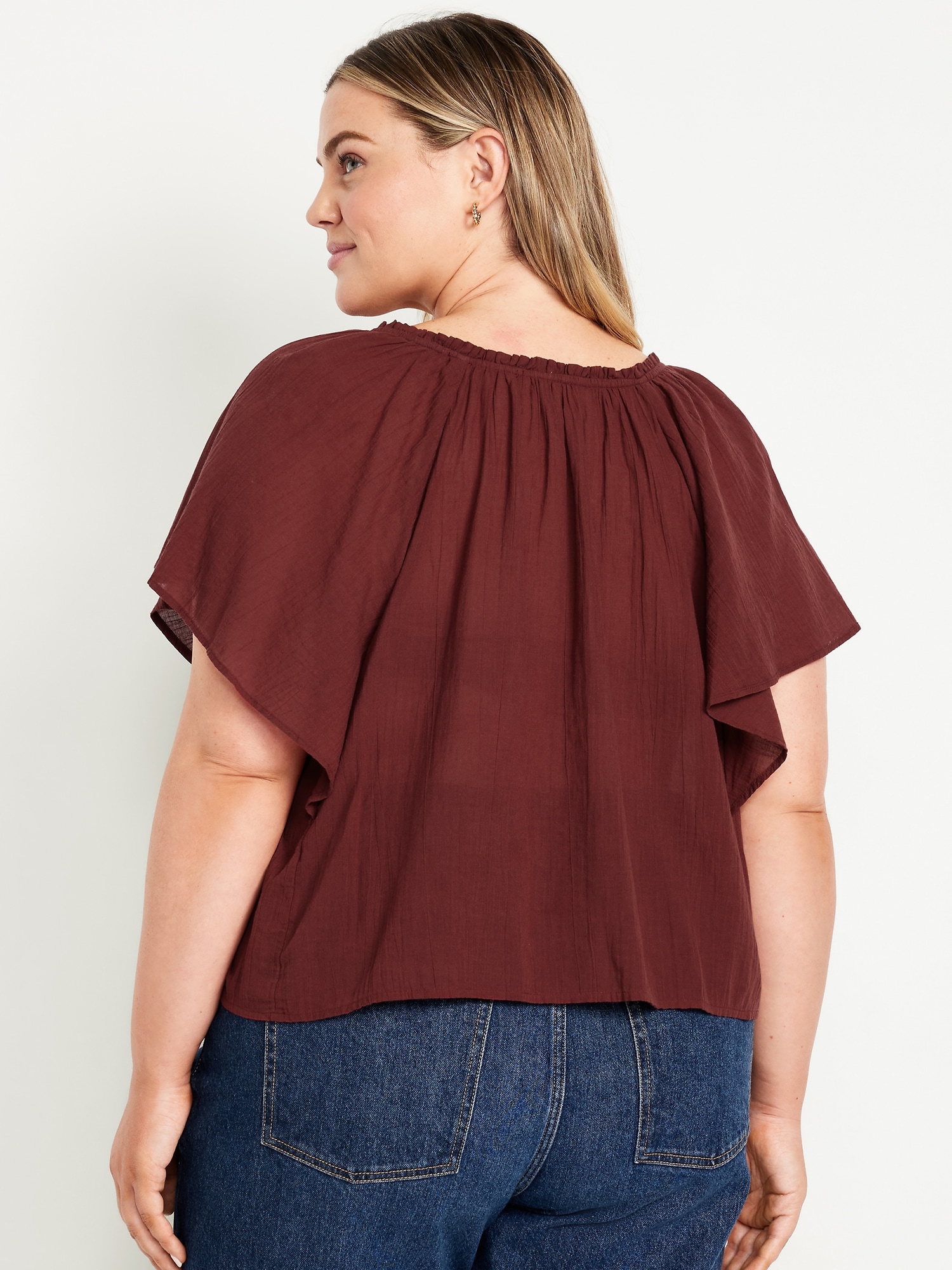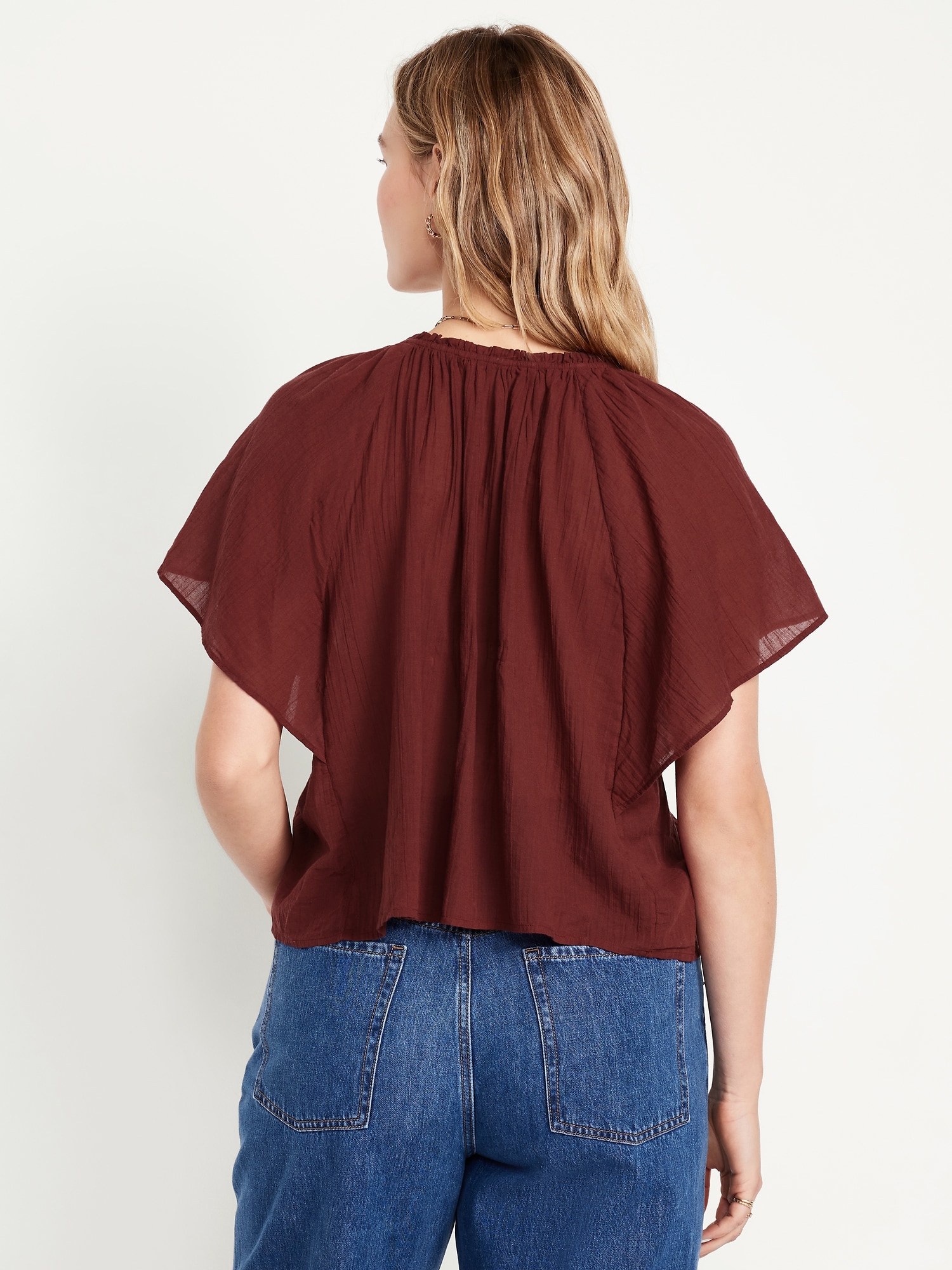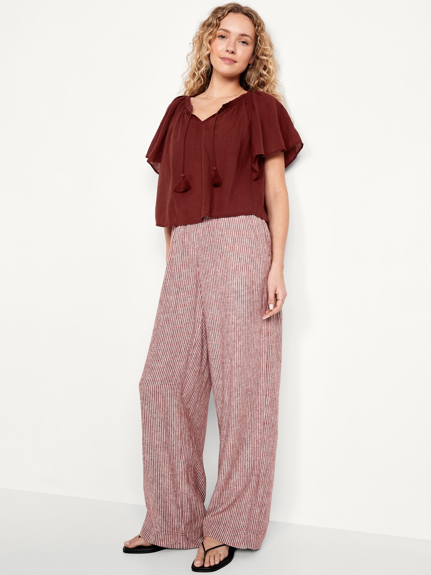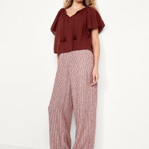Crinkle Gauze Tassel-Tie Shirred Top: v-neck tassel-tie front, short flutter sleeves, shirred detail, #764192