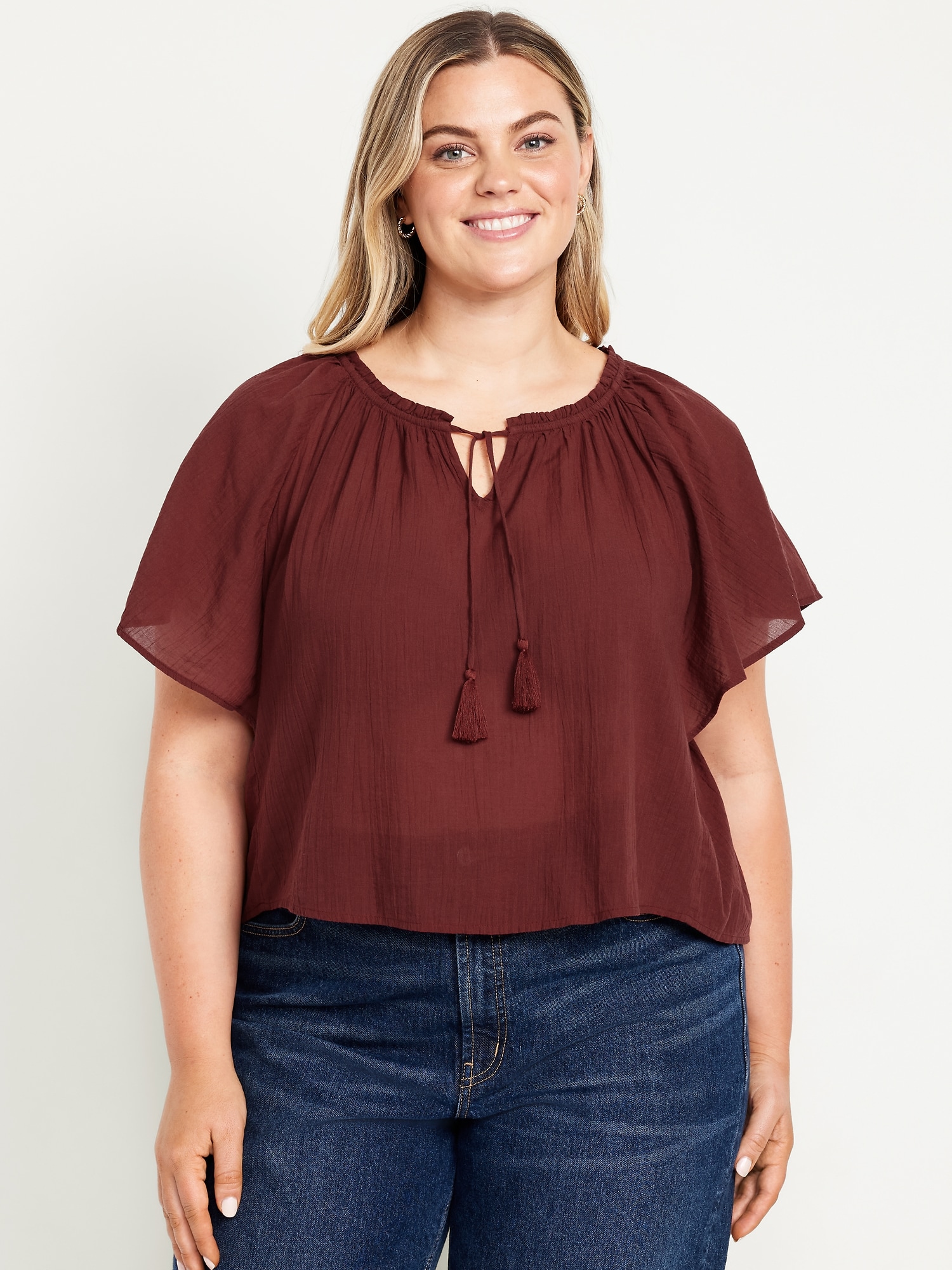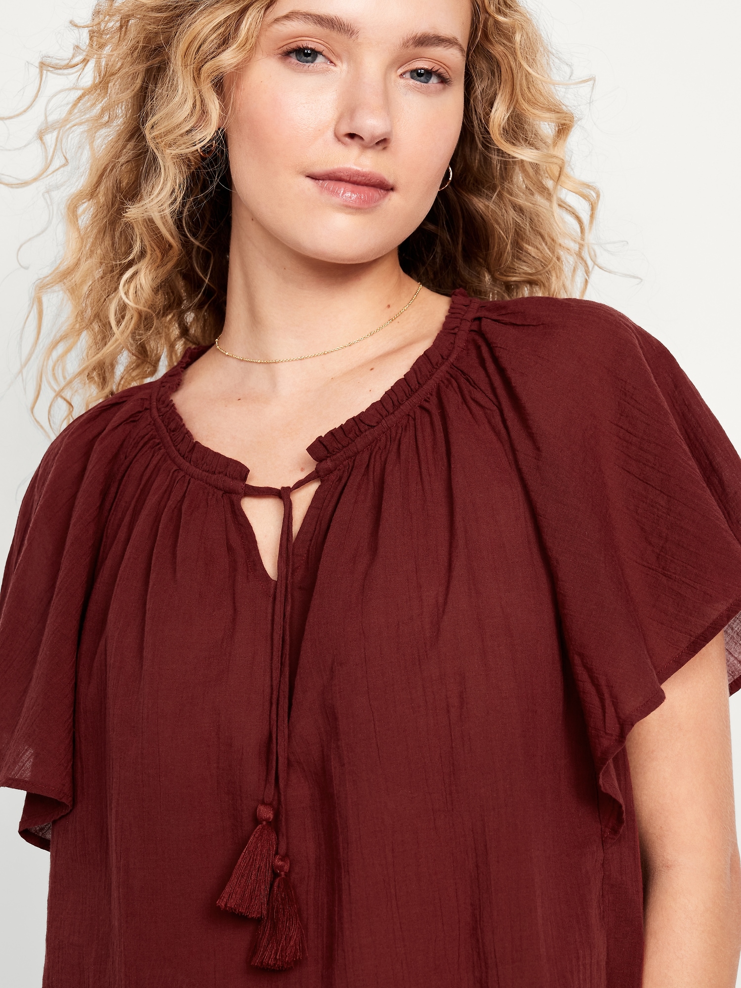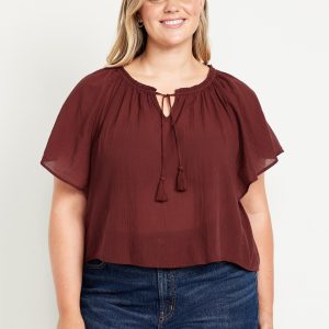 Crinkle Gauze Tassel-Tie Shirred Top