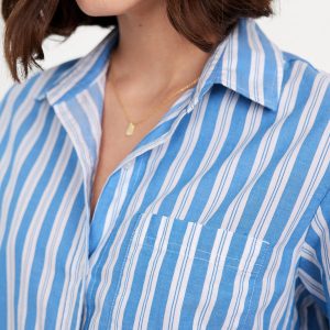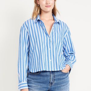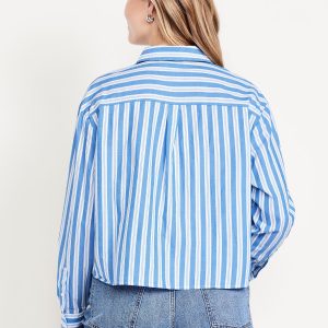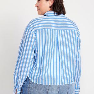 Cropped Button-Down Shirt: spread collar, long sleeves with buttoned cuffs, full-button front, patch chest pocket, vertical striped print, #825106