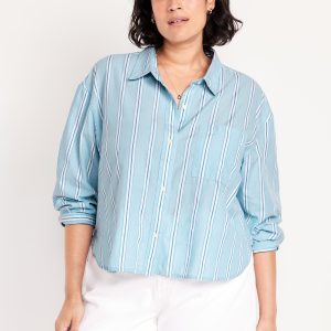 Cropped Button-Down Striped Shirt: spread collar, long sleeves with buttoned cuffs, full-button front, patch chest pocket, vertical striped print, #825106