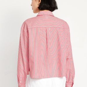 Cropped Button-Down Striped Shirt: spread collar, long sleeves with buttoned cuffs, full-button front, patch chest pocket, vertical striped print, #825106