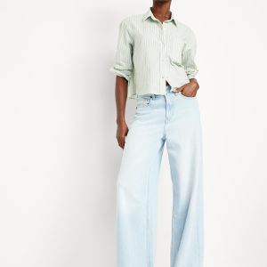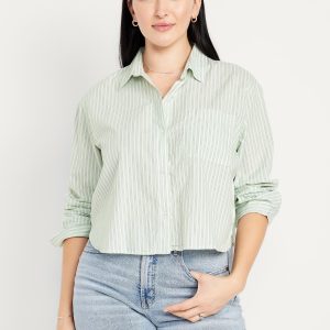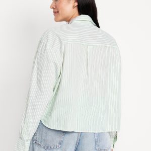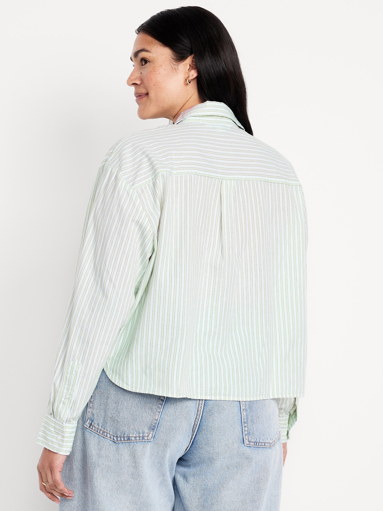 Cropped Button-Down Striped Shirt: spread collar, long sleeves with buttoned cuffs, full-button front, patch chest pocket, vertical striped print, #825106