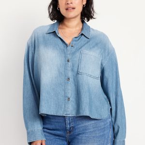 Cropped Jean Button-Down Shirt: spread collar, long sleeves with buttoned cuffs, full-button front, patch chest pocket, vertical striped print, #825106