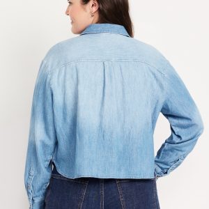 Cropped Jean Button-Down Shirt: spread collar, long sleeves with buttoned cuffs, full-button front, patch chest pocket, vertical striped print, #825106