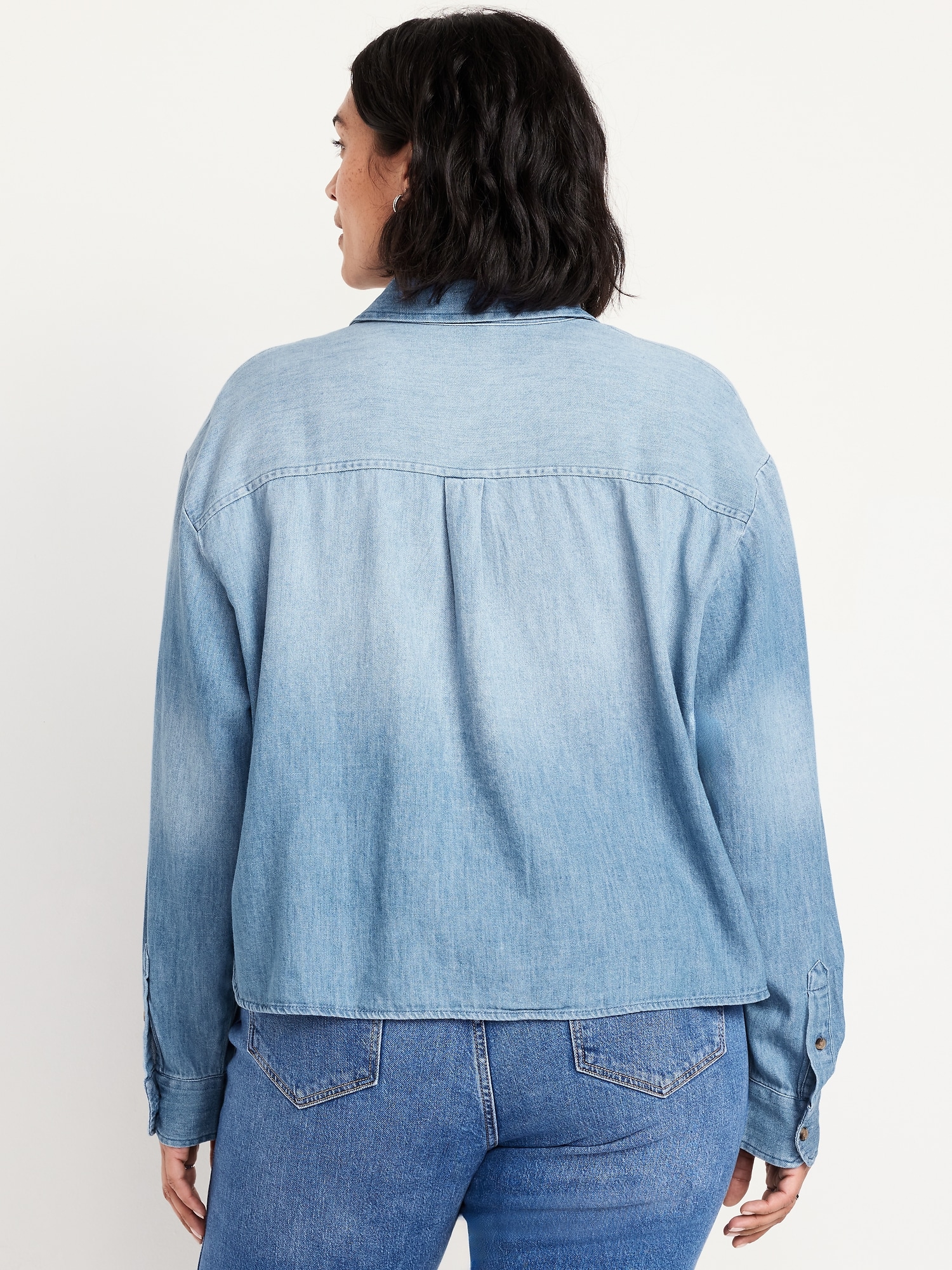 Cropped Jean Button-Down Shirt: spread collar, long sleeves with buttoned cuffs, full-button front, patch chest pocket, vertical striped print, #825106