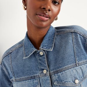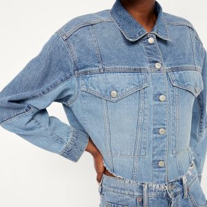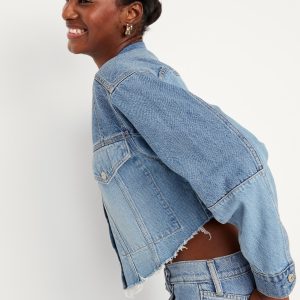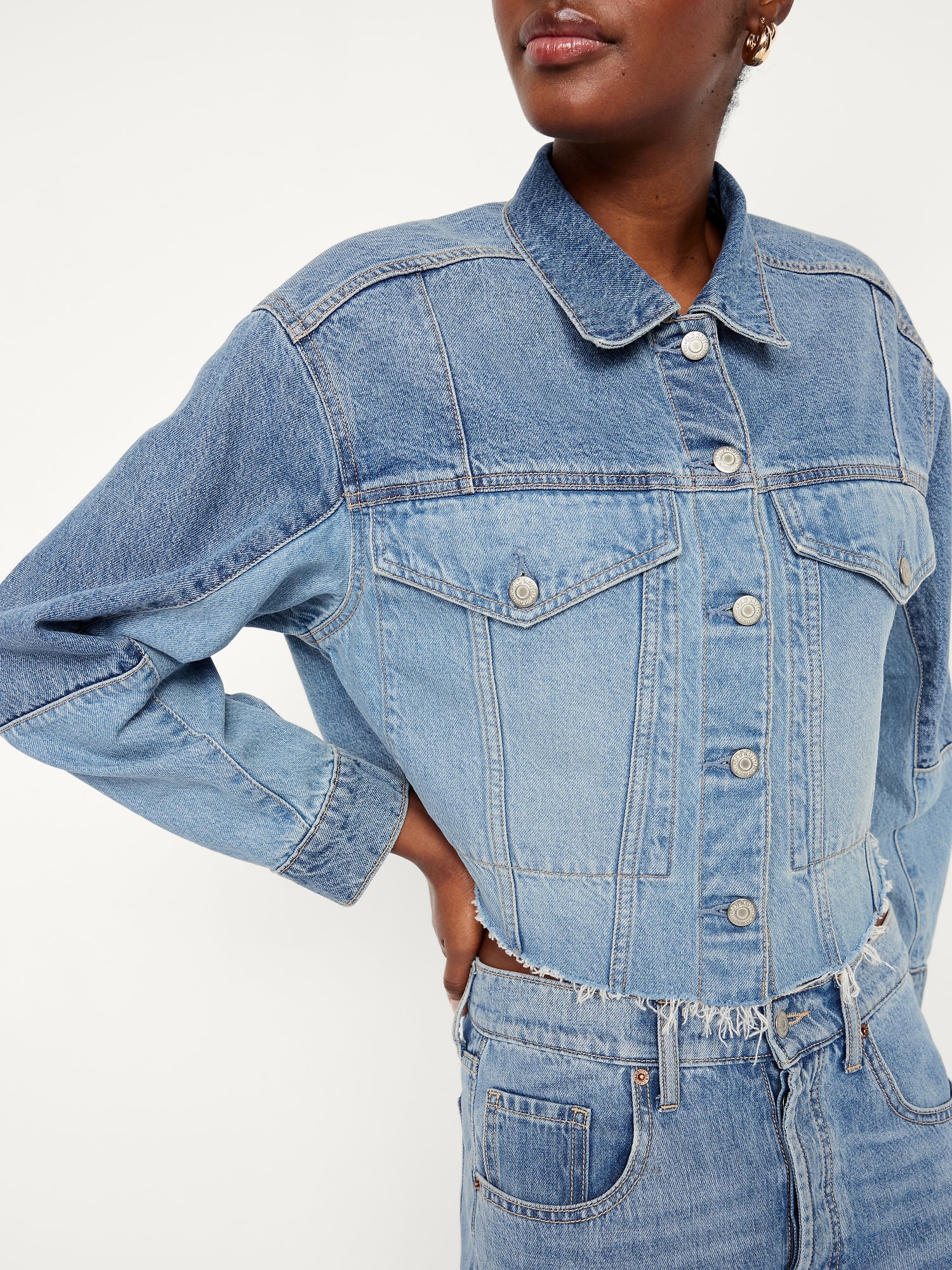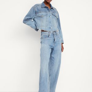 Cropped Jean Jacket: spread collar, long sleeves with buttoned cuffs, flap-button chest pockets, full-button front, cut-off hem, #766313