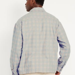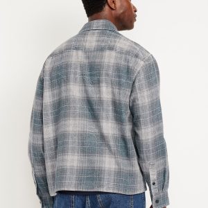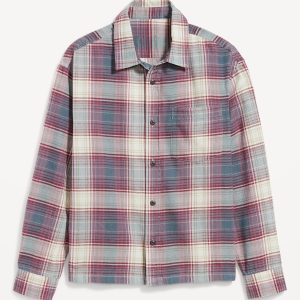 Cropped Plaid Flannel Shirt: spread collar, long sleeves with buttoned cuffs, full-button front, patch chest pocket, plaid print, #805557