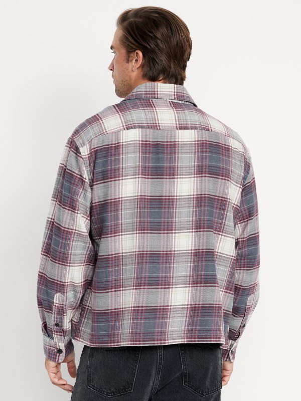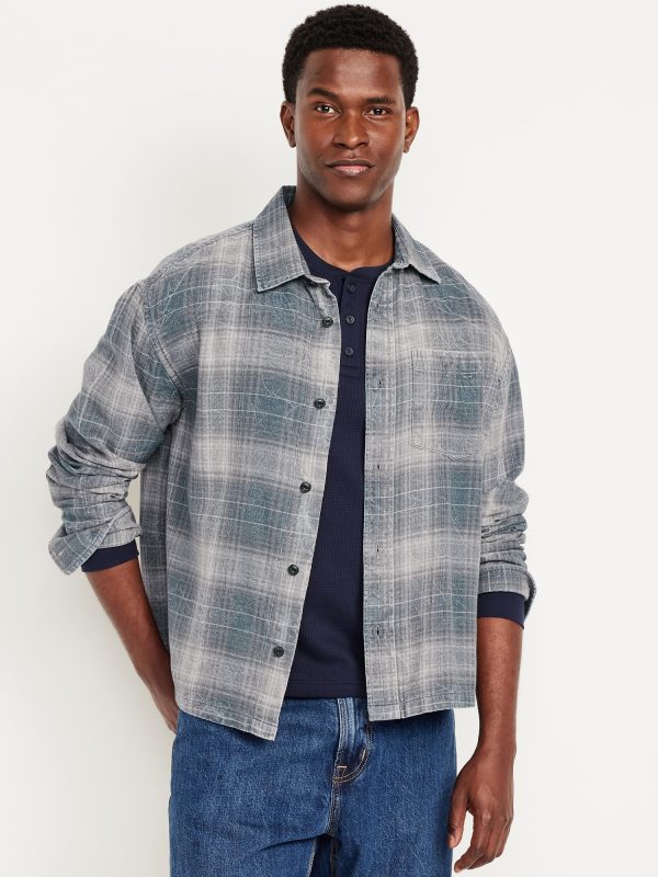 Cropped Plaid Flannel Shirt: spread collar, long sleeves with buttoned cuffs, full-button front, patch chest pocket, plaid print, #805557