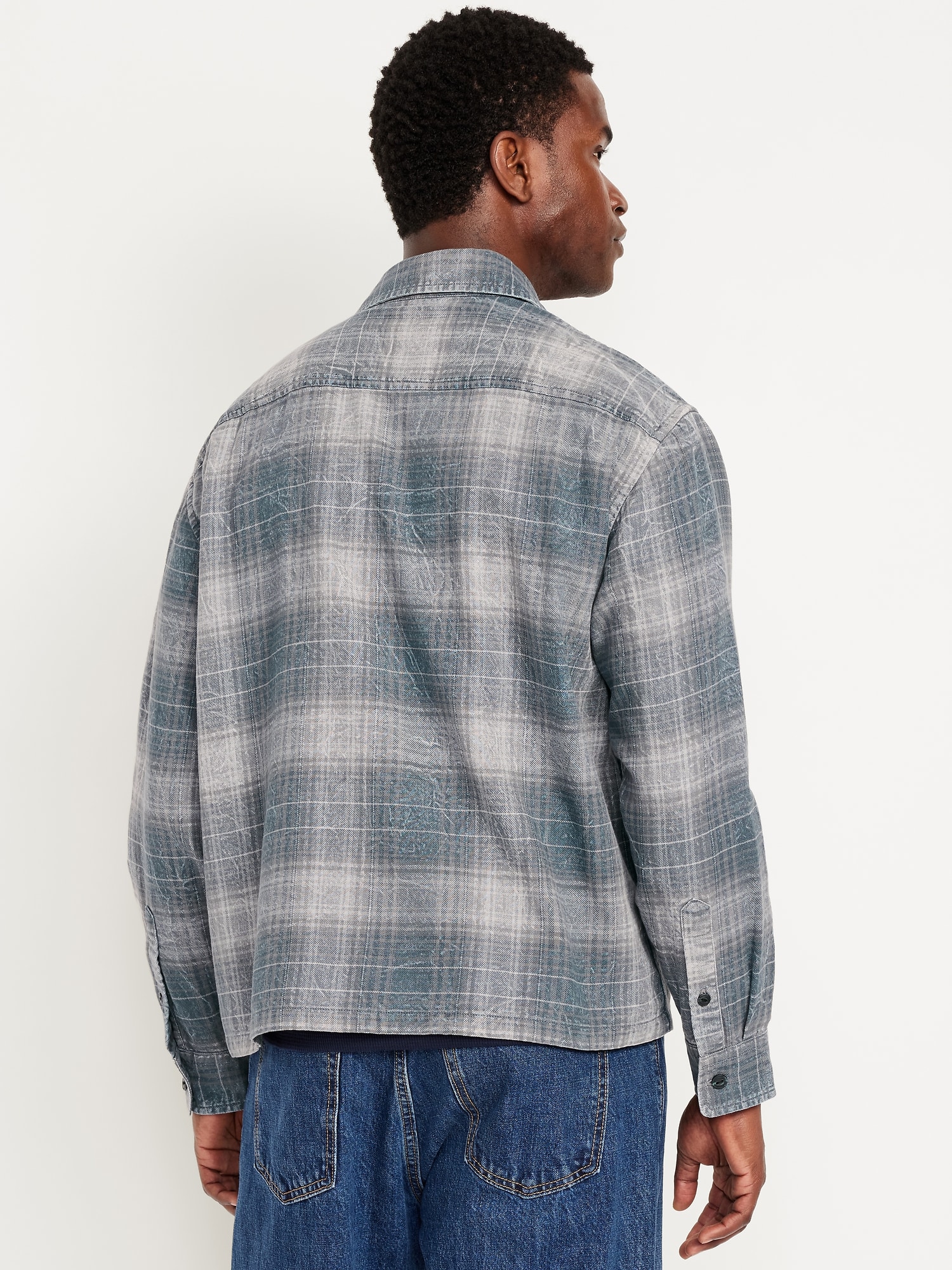 Cropped Plaid Flannel Shirt: spread collar, long sleeves with buttoned cuffs, full-button front, patch chest pocket, plaid print, #805557